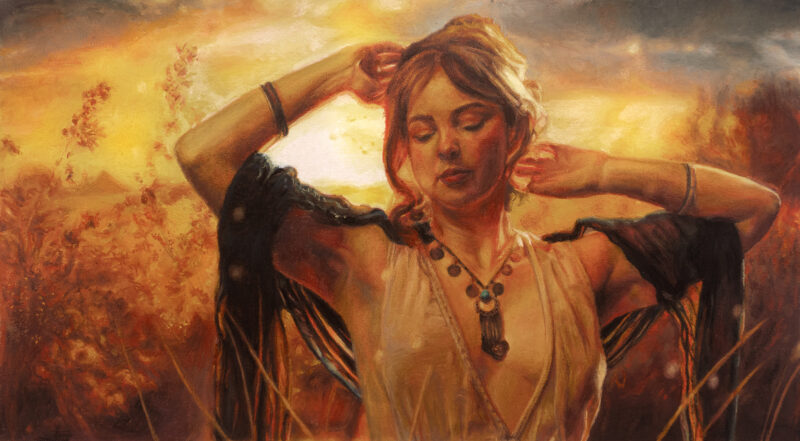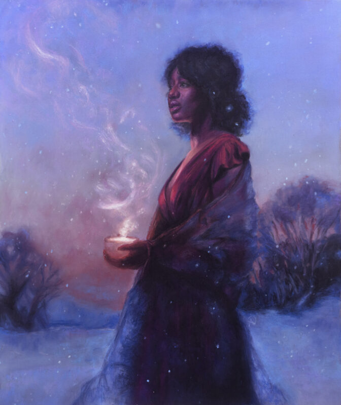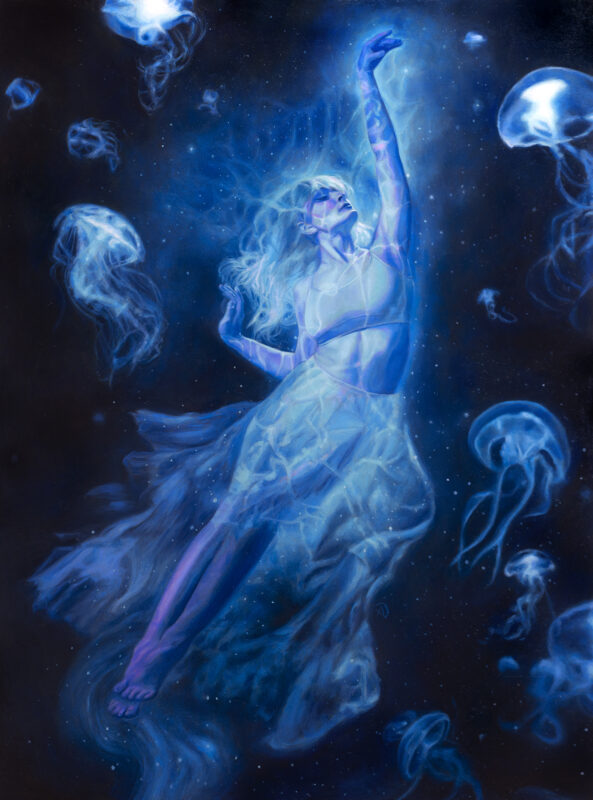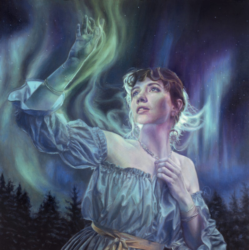 Alexandra (b. 1994) is an artist based in Toms River, New Jersey. Alexandra creates oil paintings and mixed media drawings depicting figurative, imaginative realism art. She attempts to give form to things that are insubstantial, such as goals, dreams, and feelings of hope and longing. Elegant characters inhabit ethereal atmospheres that encompass their story. Her use of lighting creates ephemeral scenes that are meant to encourage the viewer to insert their own experiences with fleeting feelings and special moments in their lives. Her painting technique is inspired by classical methods of oil painting involving a tonal underpainting, and color built up over multiple layers. Her drawings are mixed media pieces often utilizing graphite, charcoal and pan pastels along with many other experimental mediums.