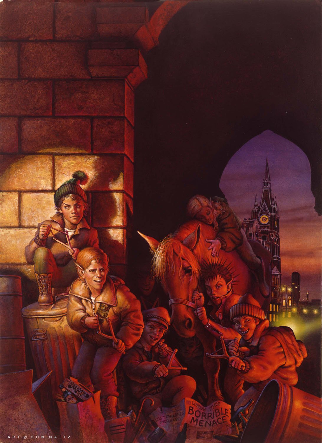 24 x 17 inches, acrylic on panel. Framed. Cover to Michael De Larrabetti's BORRIBLES ACROSS THE DARK METROPOLIS, Berekley Publishing, 1987.