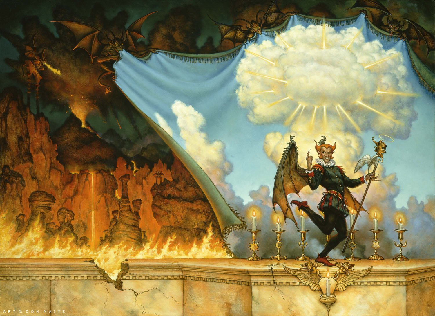 20 x 27 inches, oil on panel. Framed. Cover to Roger Zelazny and Robert Sheckley's A FARCE TO BE RECKONED WITH, Bantam Books, 1994.