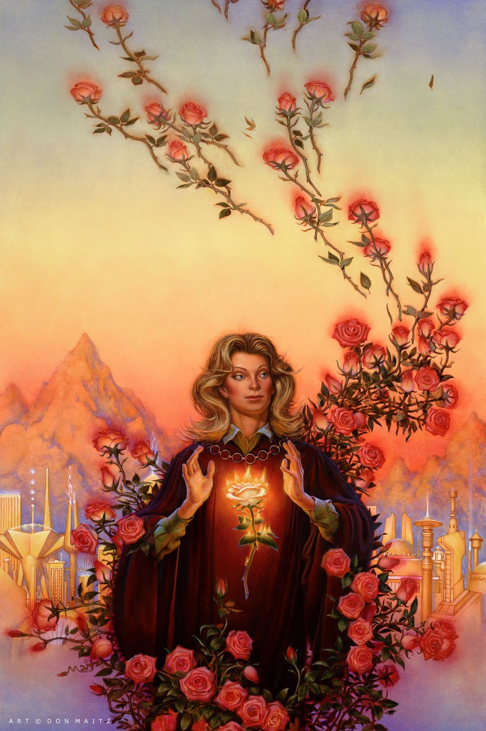 30 x 20 inches, oil on panel. Framed. Cover to Diane Duane's STEALING THE ELF KING'S ROSES, Warner Books, 2001.