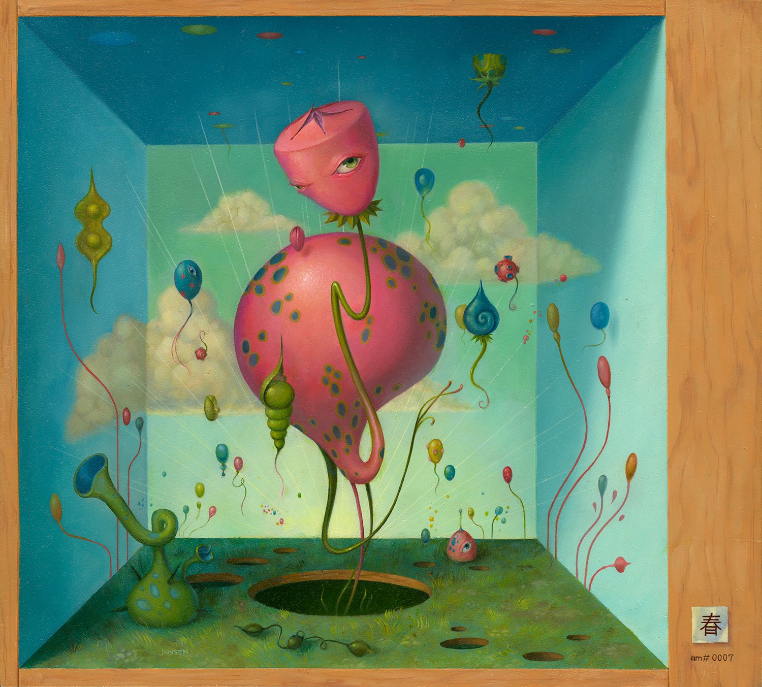 18" x 20", oil on panel. 2013. My art series ALIEN MENAGERIE depicts imaginary beings in a contained environment that is part specimen box, part diorama, and part window into another world. It's informed by my interest in science fictional imagery, but the creatures within are more dream than speculation, individuals of feeling and awareness, and sometimes purpose.