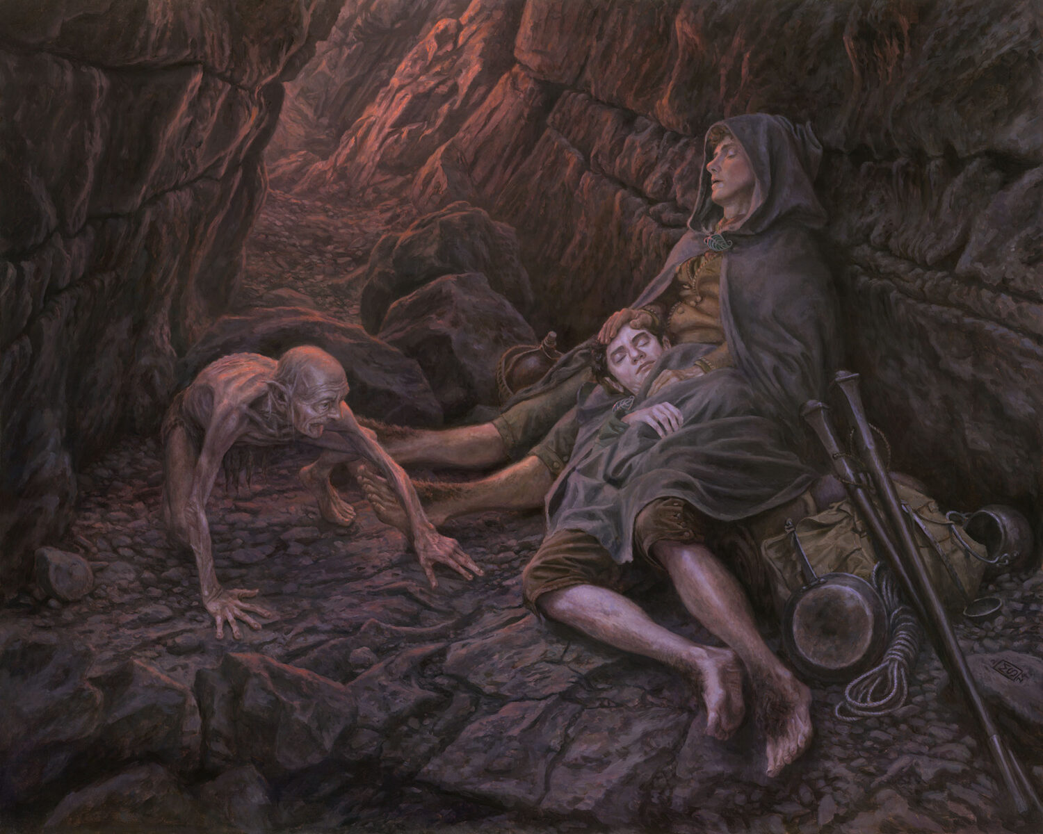This painting, " An Old Starved Pitiable Thing" takes its name from a passage from The Lord of the Rings. It depicts the scene where Sméagol returns to Frodo and Sam after meeting with Shelob. The last glimmer of whatever empathy and friendship Sméagol was capable of is expressed here. It’s the last of the old hobbit. It’s all Gollum the creature from here. Sméagol would not be redeemed. I’ve read that after writing this passage, Tolkien wept. After completing the drawing last year, I thought that such a scene image should be developed more in oil color.