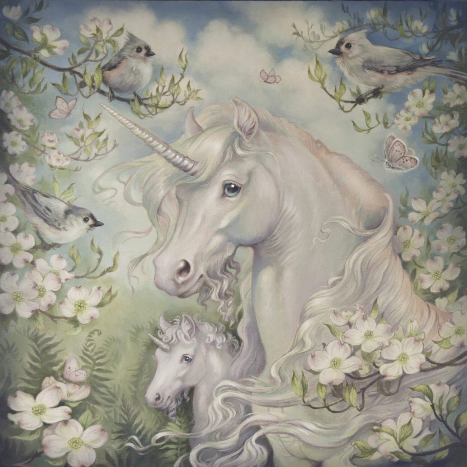 12x12 inch acrylic unicorn portrait painting on wood panel, framed.