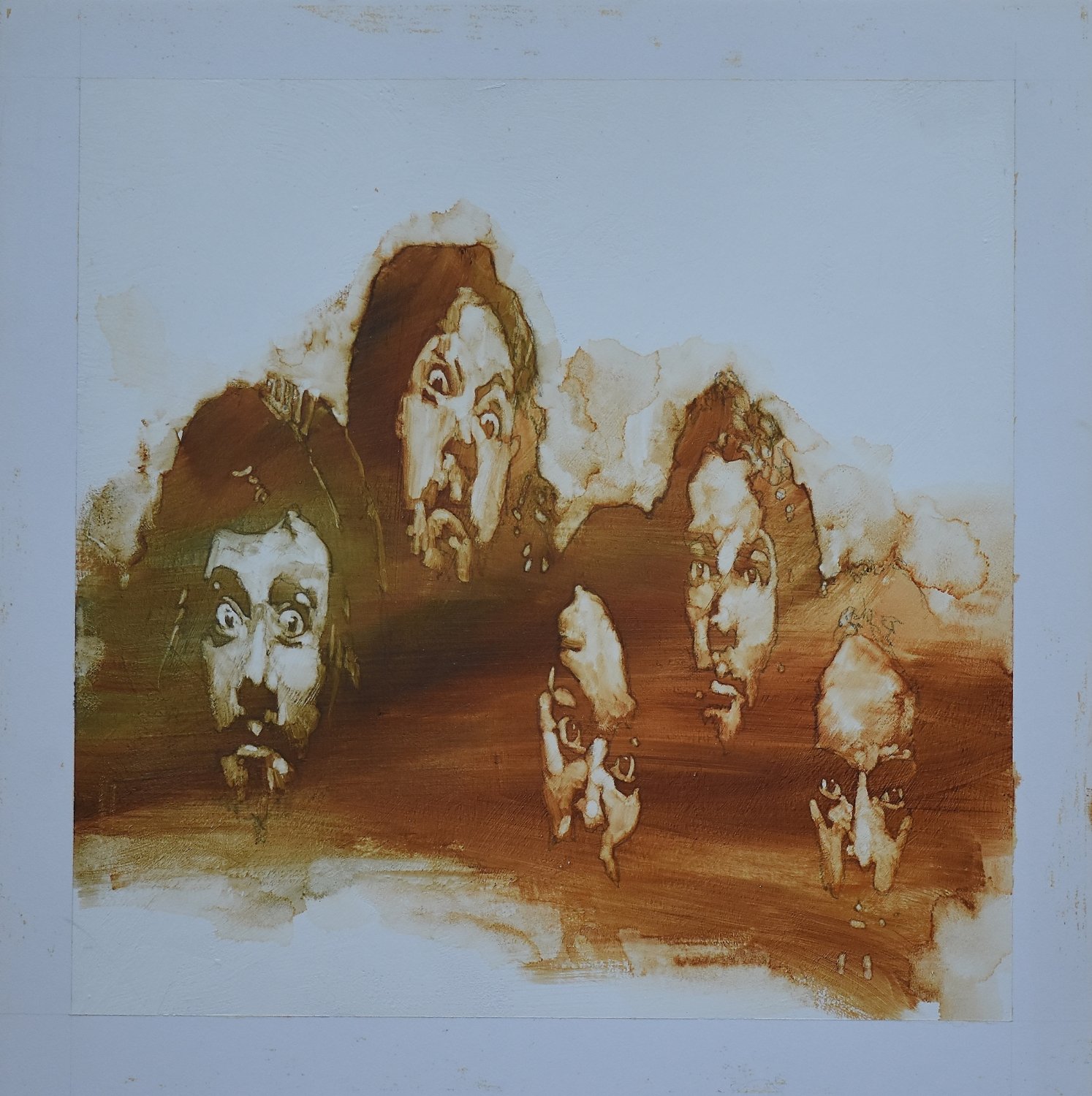 15 x 15 inches, oil on gessoed illustration board, circa 1989. Personal piece of one of my favorite bands. I've always liked the artwork of David Grove and this was a piece exploring his technique. Also, I enjoyed stretching/elongating the reference material. Condition: Some warping and tape residue