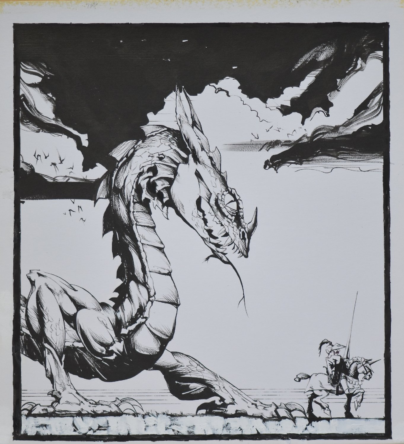 13.5 x 14.75 inches, ink and white acrylic on illustration board, circa 1987. Personal piece. Condition: Tape residue along top. Small cuts to remove unwanted inking on outside of the image.