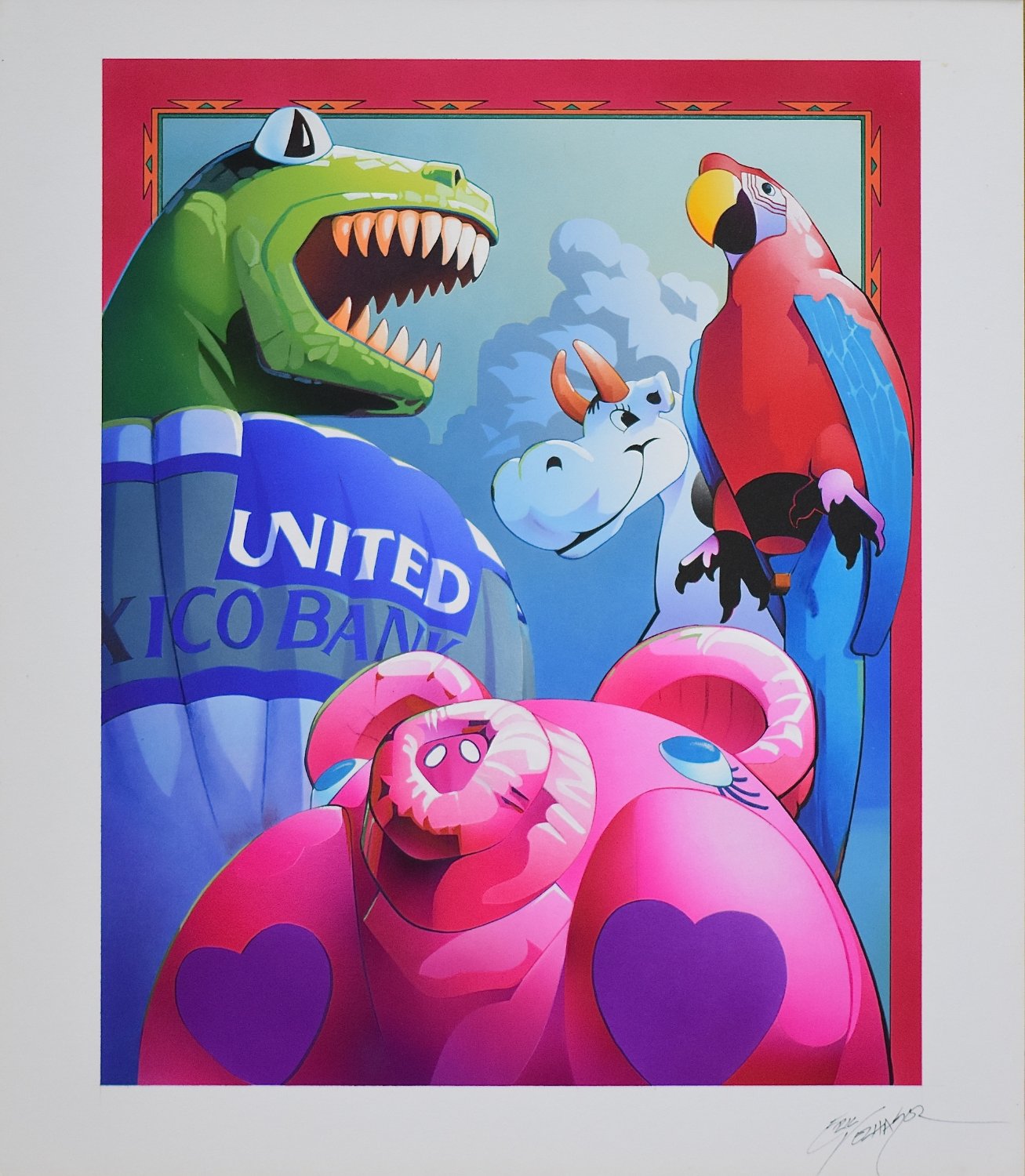 16 x 19 inches, gouache on illustration board, circa 1992. Artwork for an Ad for a local bank that coincided with the Albuquerque International Balloon Fiesta. The Pink Pig was the mascot for the Bank. Condition: excellent.