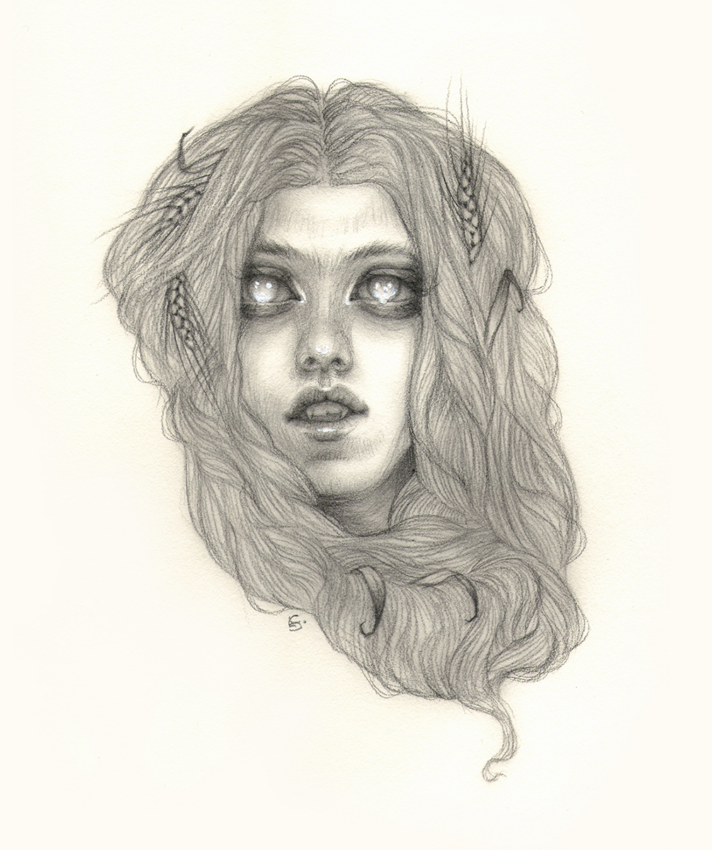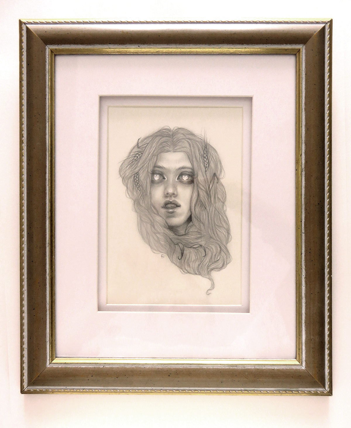 Graphite and a touch of iridescent watercolor on paper, framed to 10" x 12"