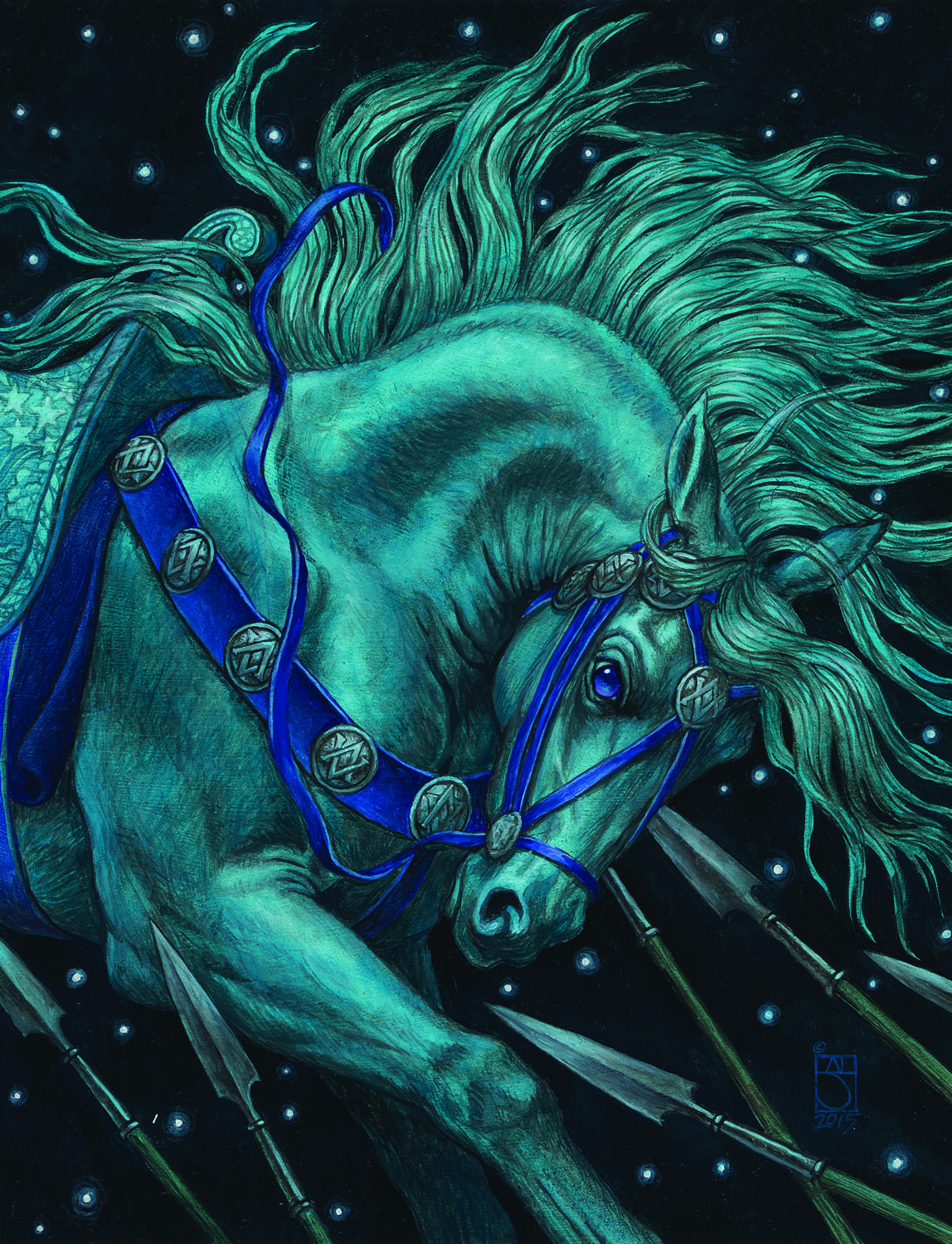 Oils on board, 2/15, 13.5 x 10.5 inches, Signed lower right. For the second book in the Herald Spy series by Mercedes Lackey. Always searching for a new angle on a cover, I split this design into two artworks because a spy can’t possibly be near his big white horse companion! This Dallen being menaced by spears is rather striking. It barely shows on the published cover. But that’s okay, DAW Books used it again for one of its Valdemar anthologies.