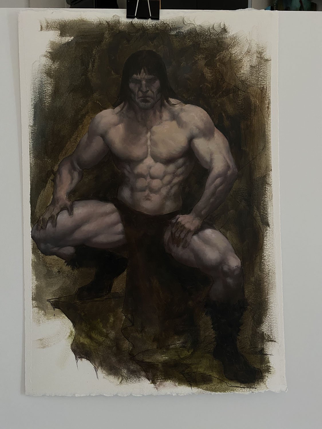 27 x 19 inches, oil and acrylic on canvas. This piece is unfinished. It is available "as is" for $3500, or can be completed and purchased for $4000.