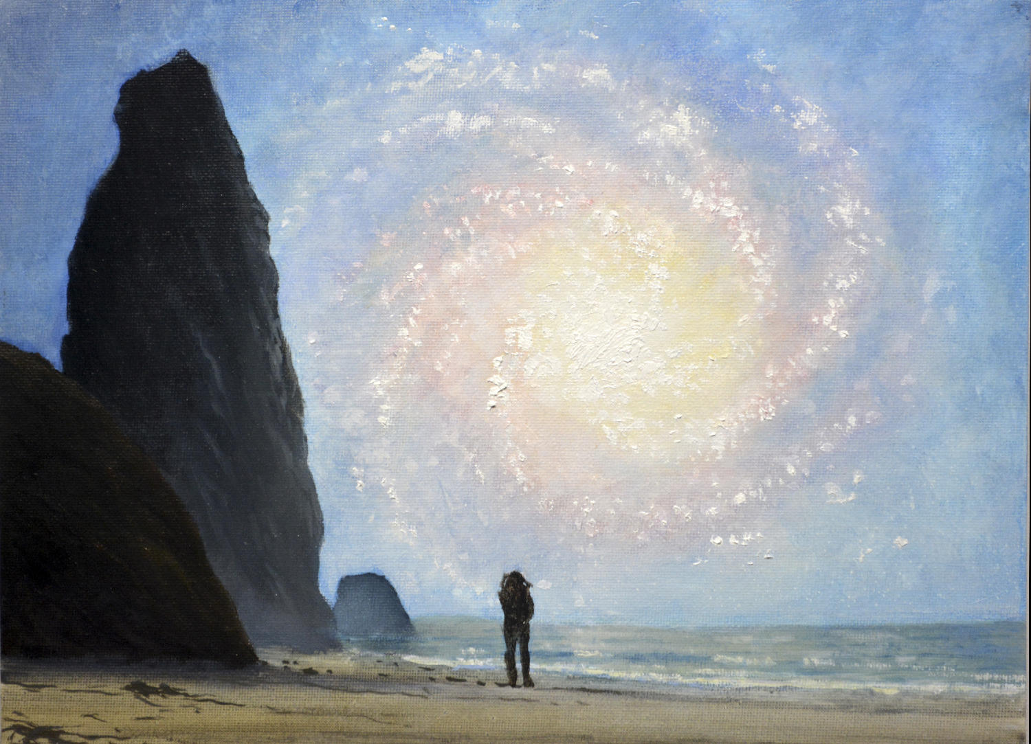 Unframed. Rudolf Otto (1869–1397) in his work, The Idea of the Holy: An Inquiry into the Non-Rational Factor in the Idea of the Divine and its Relation to the Rational written in 1923 searches for why we feel a divine presence when faced with the awe of the universe. This painting seeks to express those feelings.