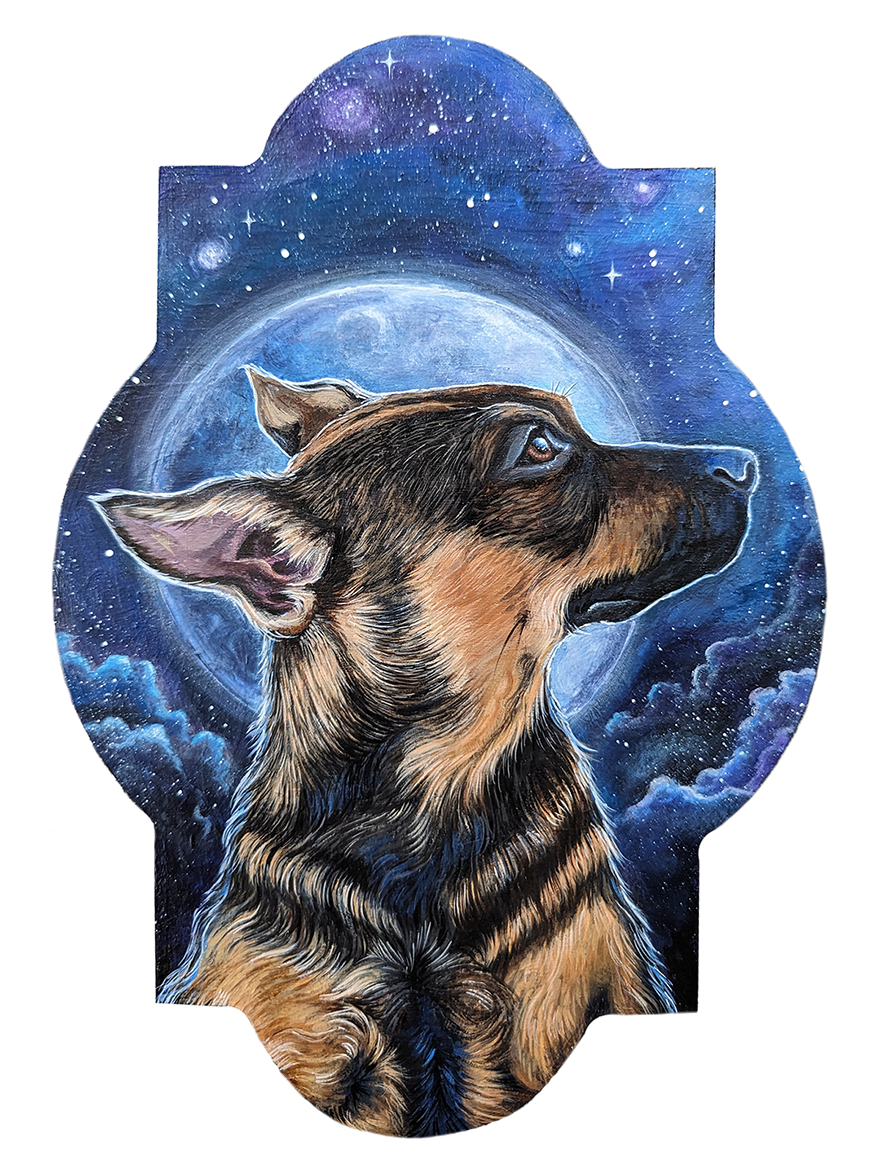 Acrylic pet portrait with cosmic background on Trekell wood panel