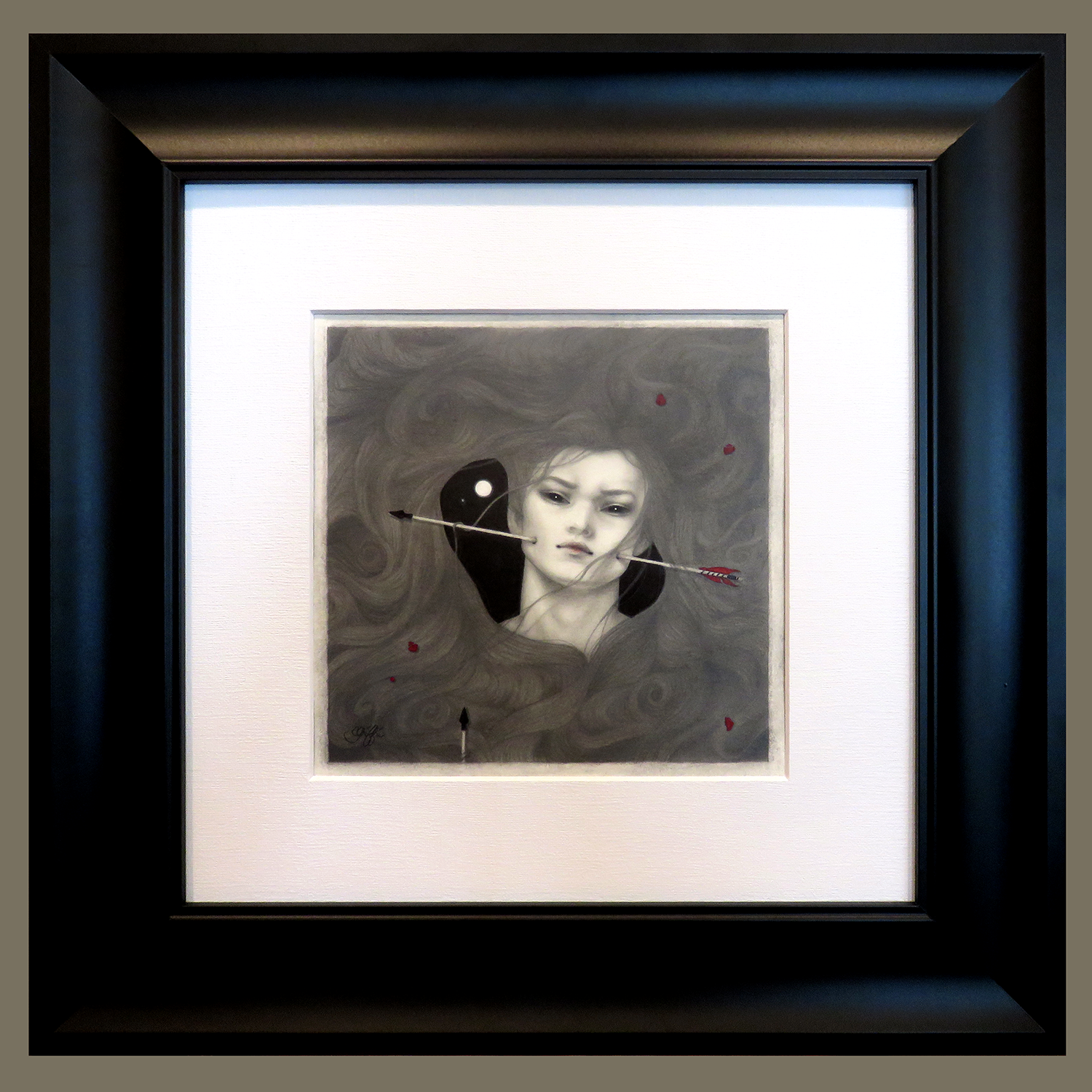 Graphite and red and black ink on paper, over a wash of iridescent watercolor, framed to 16" x 16"
