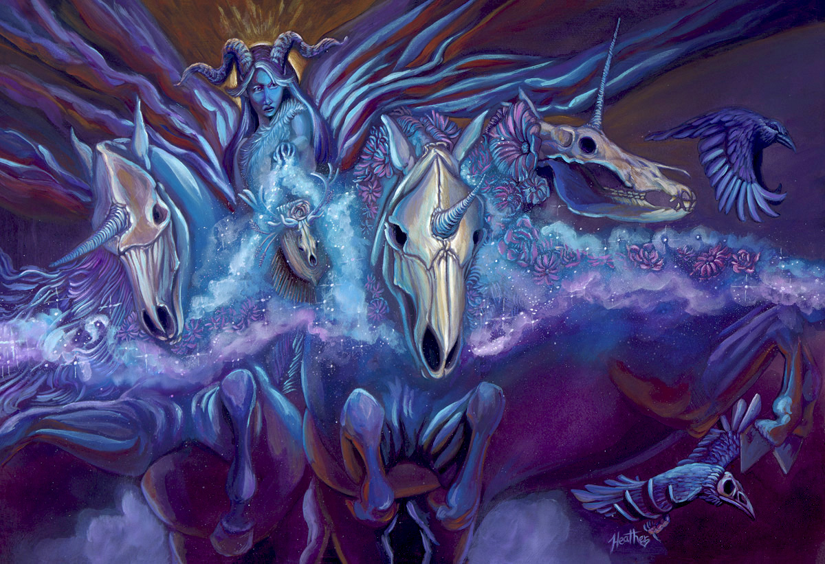 The Goddess drives her chariot through the forest, changing the seasons as she goes. The unicorns change from a season of life to a season of death in the great wheel of life. Acrylic ink on illustration board.
