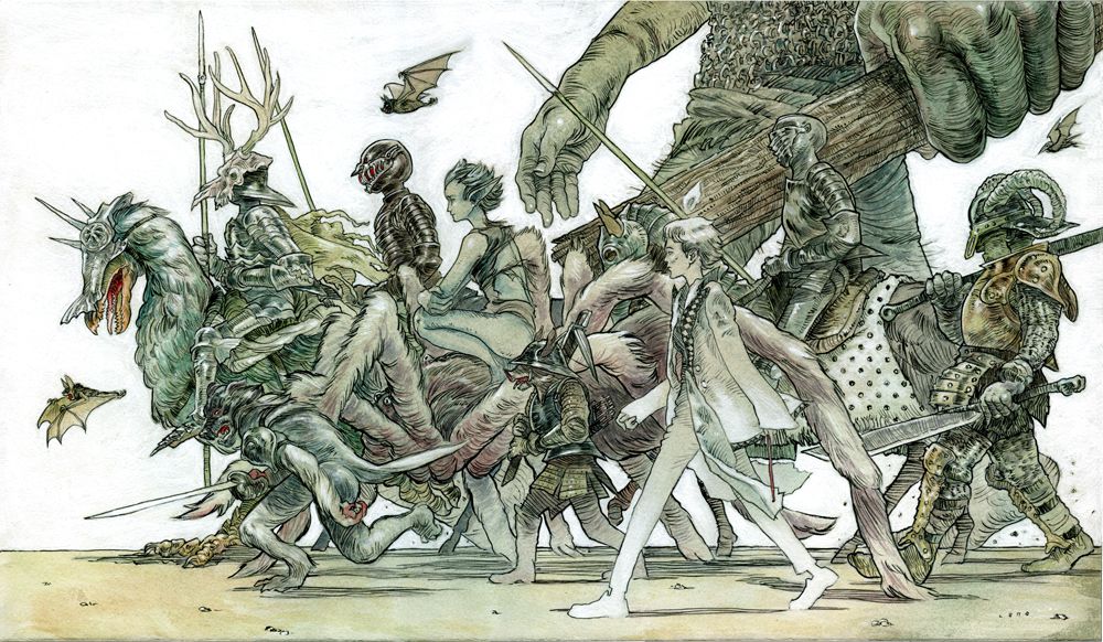 "Dark March" is a study of characters in motion, costume and demeanor. Each individual has its own unique story and drive as indicated by pose and adornment, while they march inexplicably to an unknown destination. I am proud to offer this original painting here through the IX Gallery.
