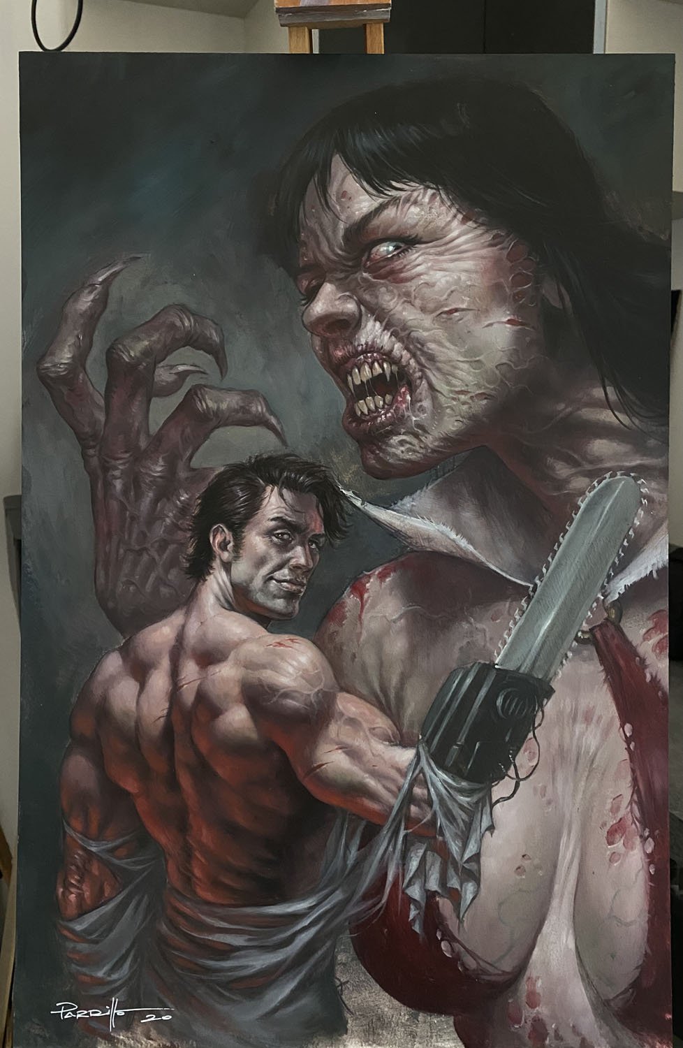 13 x 20 inches, oil and acrylic on canvas. Cover to Die!Namite Lives #1.