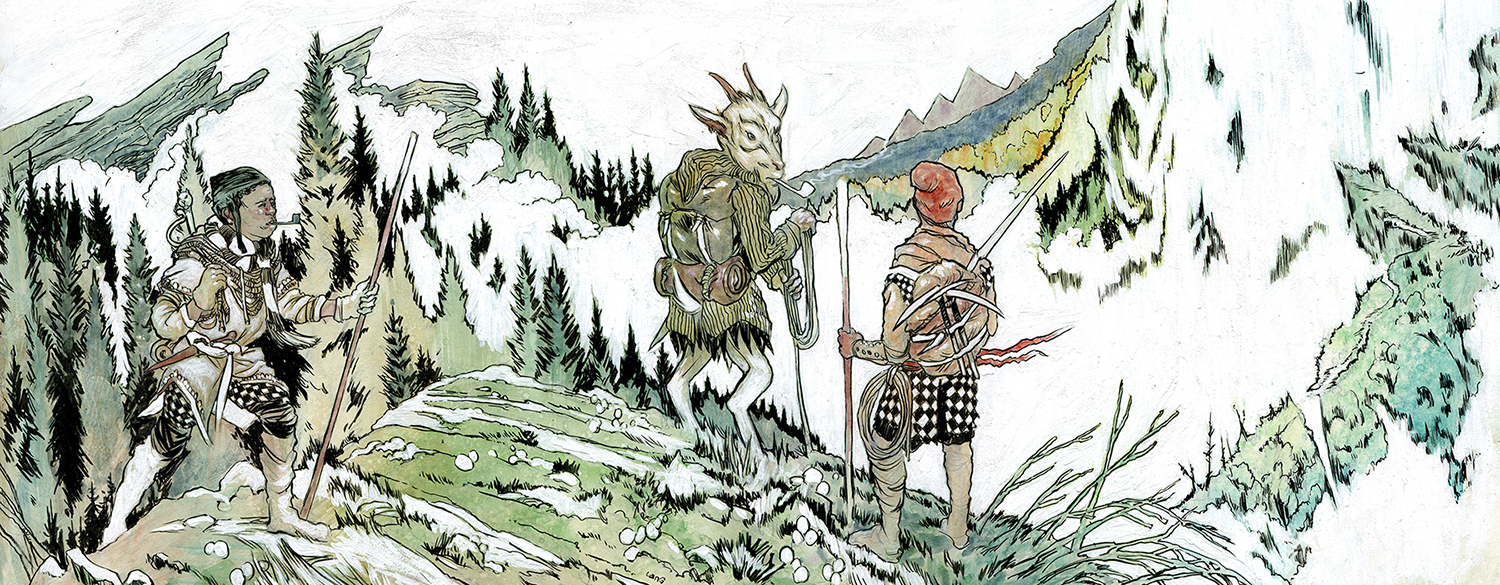 This original painting is a spread illustration from the incredible Dolmenwood tabletop RPG from Exalted Funeral. ‘Hazards’ is framed and measures 23” x 10”, is varnished and sealed.