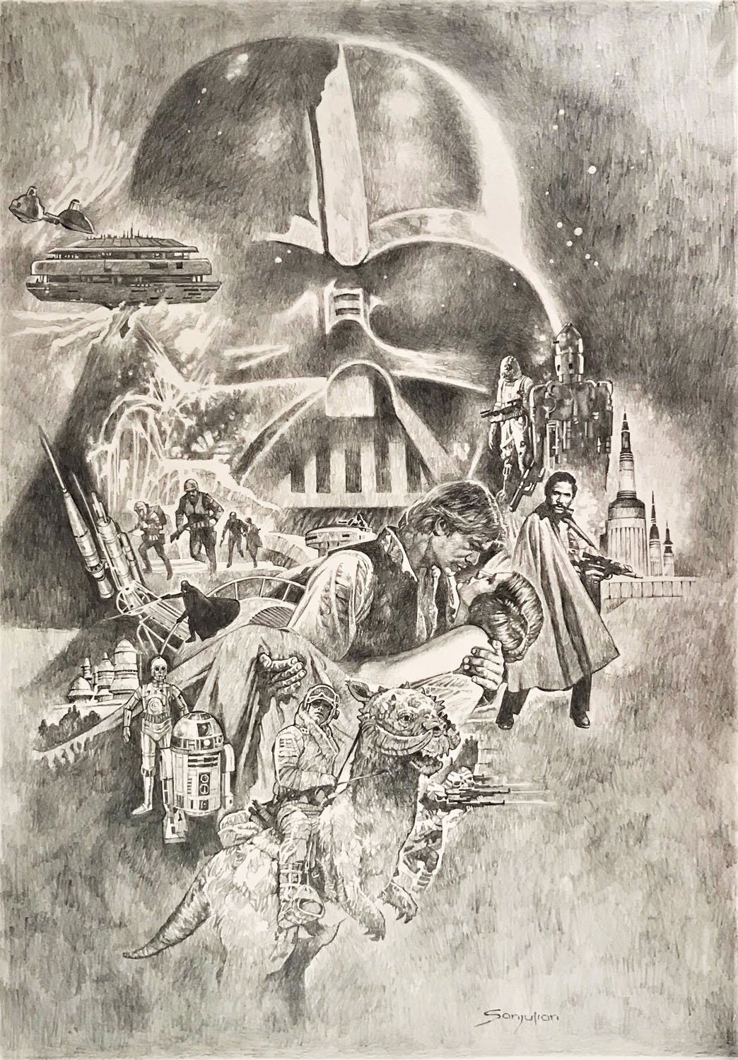 20 x 28 inches, pencil on paper. 1990s. This is the one and only recreation of the original drawing for the EMPIRE STRIKES BACK movie poster done by Sanjulian and subsquently painted by Roger Kastel. The original drawing is part of the Sanjulian family collection and is permanently NFS, so Sanjulian created this 1-to-1 reproduction for exhibition and display.