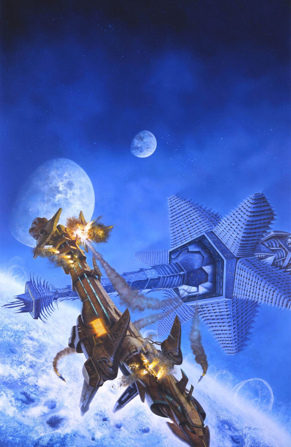26.75 x 16.75 inches, Acrylic on Gessoed illustration board. 2001. Book cover Published by Science fiction book club Authors Sean Williams & Shane Dix