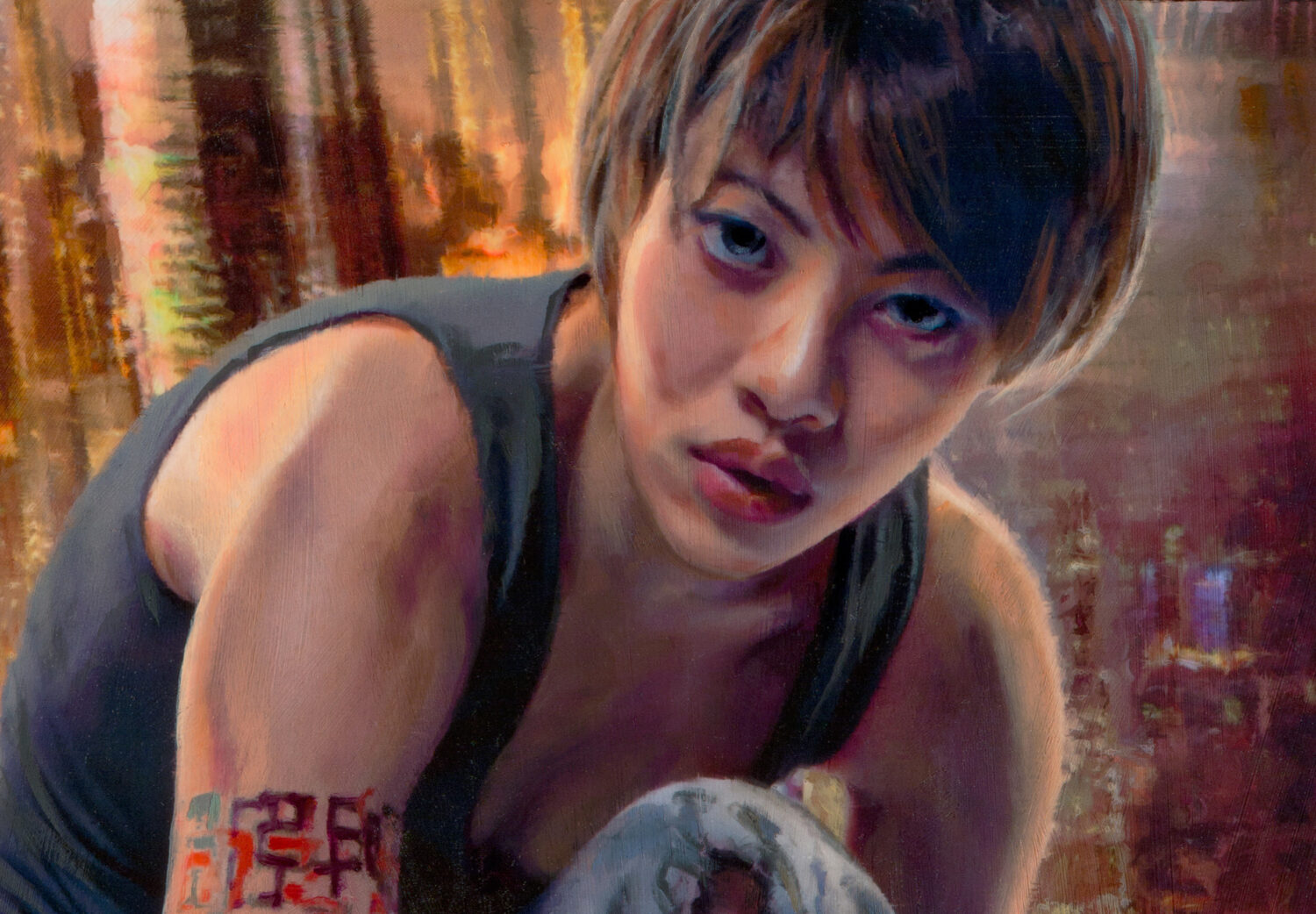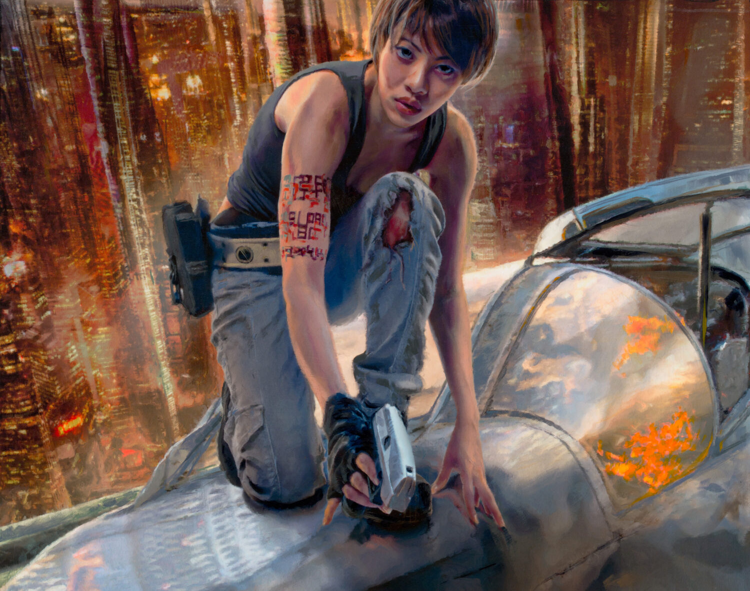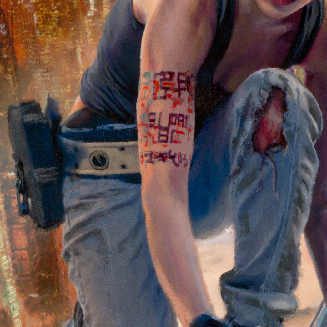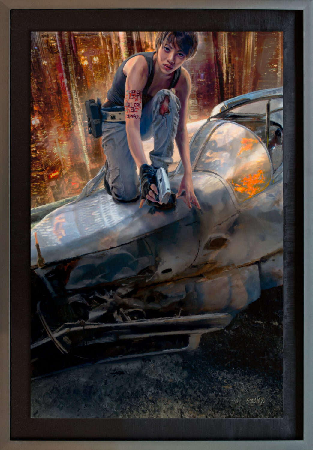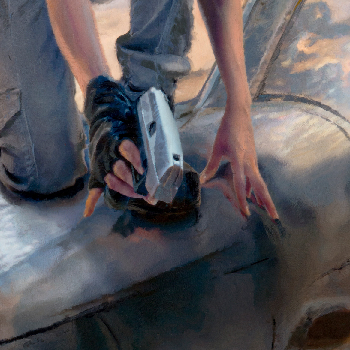 Fallout - by James K Decker for Penguin ROC - oil on board - 23" x 35 1/4" image in 28 1/2" x 41" frame - Nielsen Style 97 pewter finish museum frame.