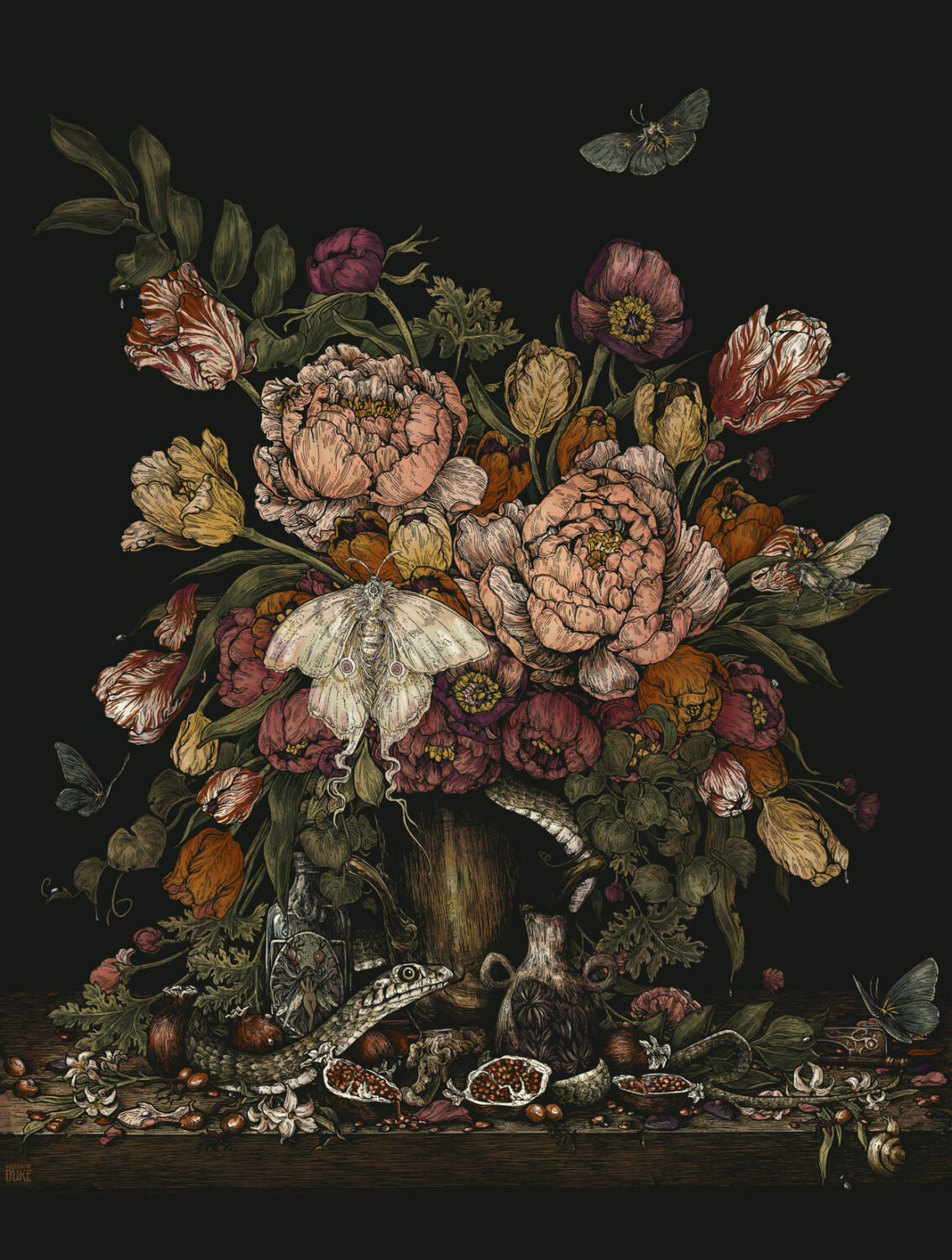 Original in Pen and Ink, 11x14"Eight color Silkscreen on French Paper Construction Whitewash