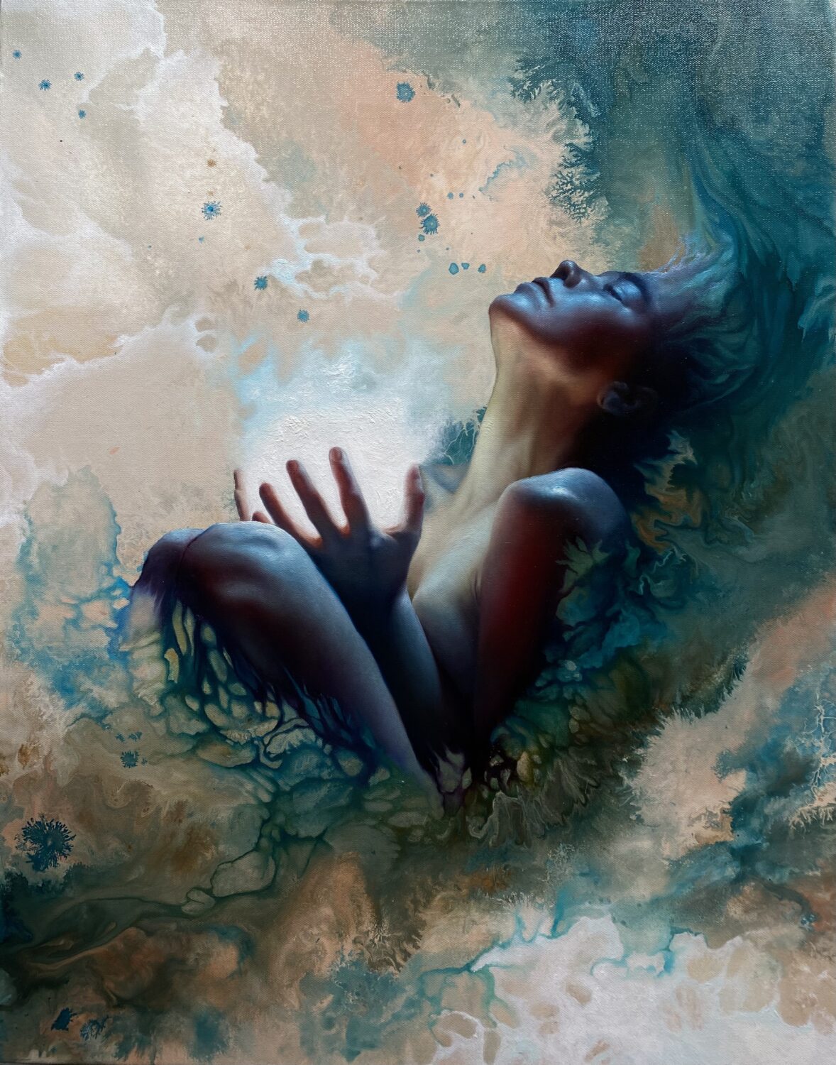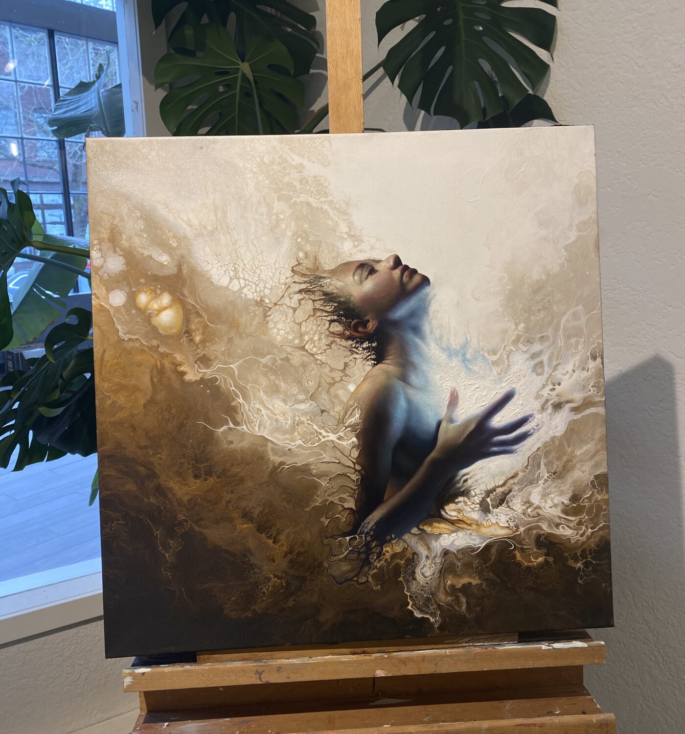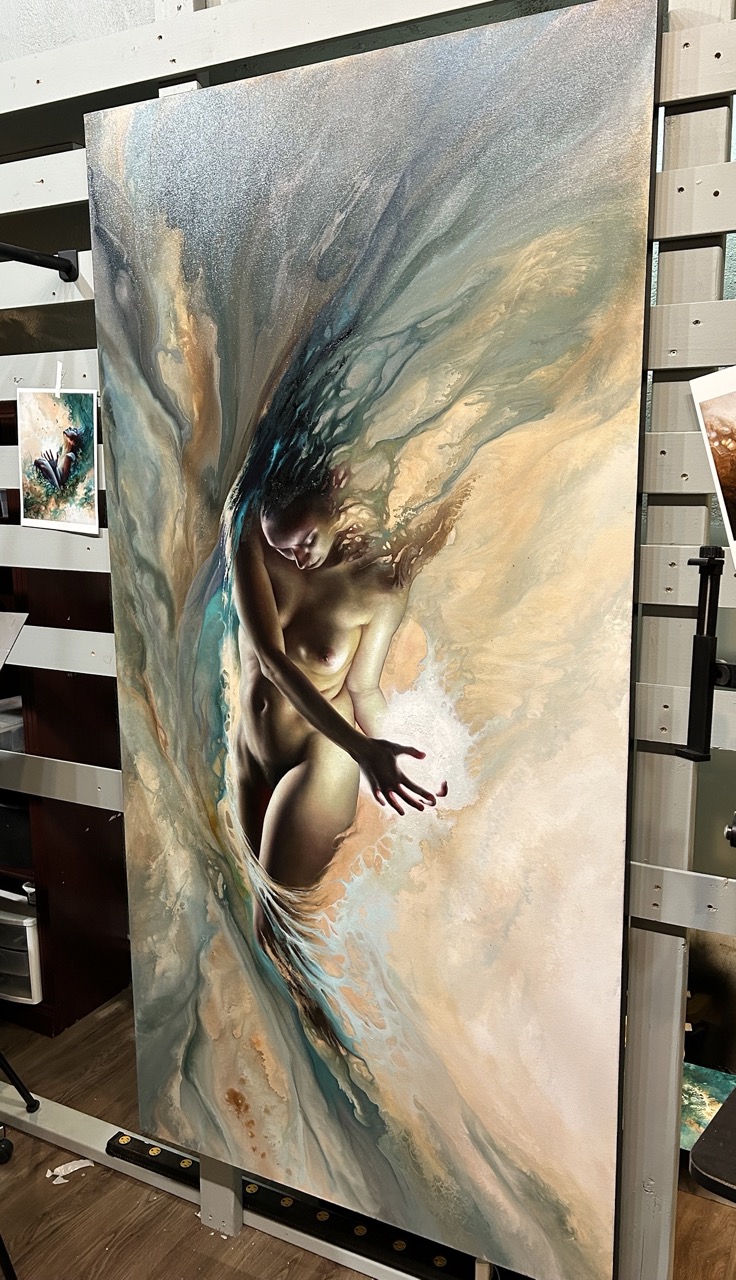 This is a special new-release painting. I have been working with another artist (Jax Mildner) https://www.instagram.com/fineartjax/in collaboration with her whimsical, elegant abstract works. This is our largest work to date and it is fresh off the easel for this show. Check out the images to see other works we have done together.