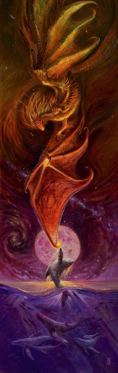 A large pod of blue whales sails through the midnight waters when suddenly a shimmering surprise evokes the heavens above them. Larger than anything imagined, a dragon is seen sweeping the heavens with its vast wingspan, gathering stars, dreams, and inspiration alike. Then, without reason, a blue whale leaps high above the waterline to strike a connection with this beautiful creature. This moment of contact is well met as the dragon stretched from the stars to create the bond of friendship among the pod.Oil on mounted paper on masonite board