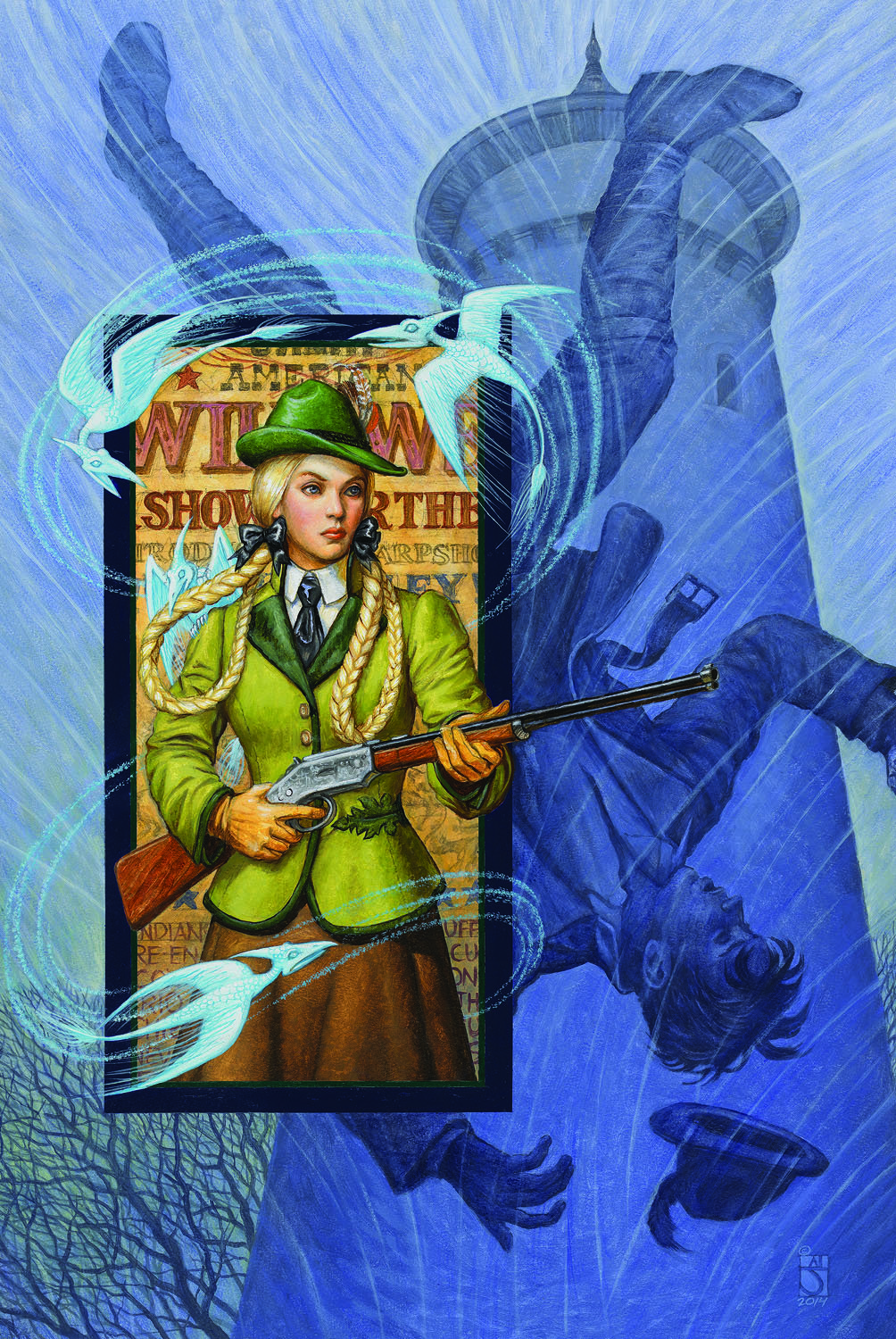 Oils on board, 9/14, 25.5 x 17 inches, Signed lower right. For the novel in the Elemental Masters series by Mercedes Lackey. The fairy tale of “Rapunzel” was the catalyst for this one. Misty’s endless research and creativity makes our heroine a sharpshooter in a Wild West Show touring in Germany!