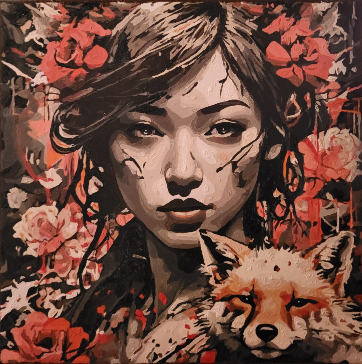 Portrait of a young Japanese woman's face, in black and white, surrounded by highly saturated red flowers. The face of a small fox is depicted next to her, implying a kitsune heritage.