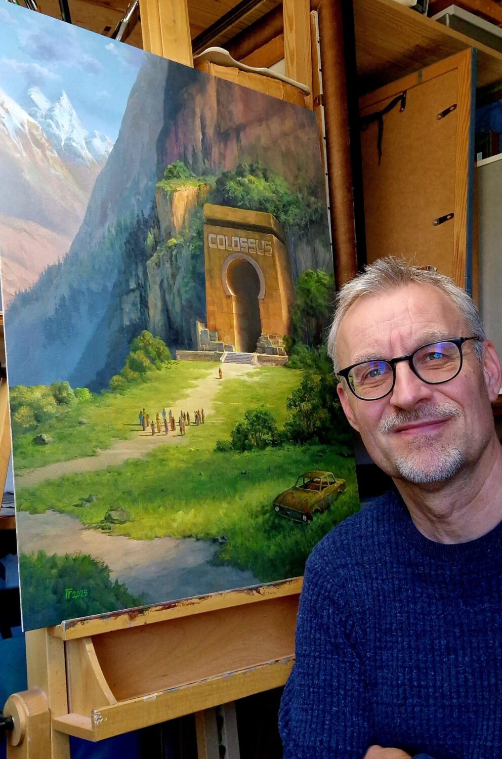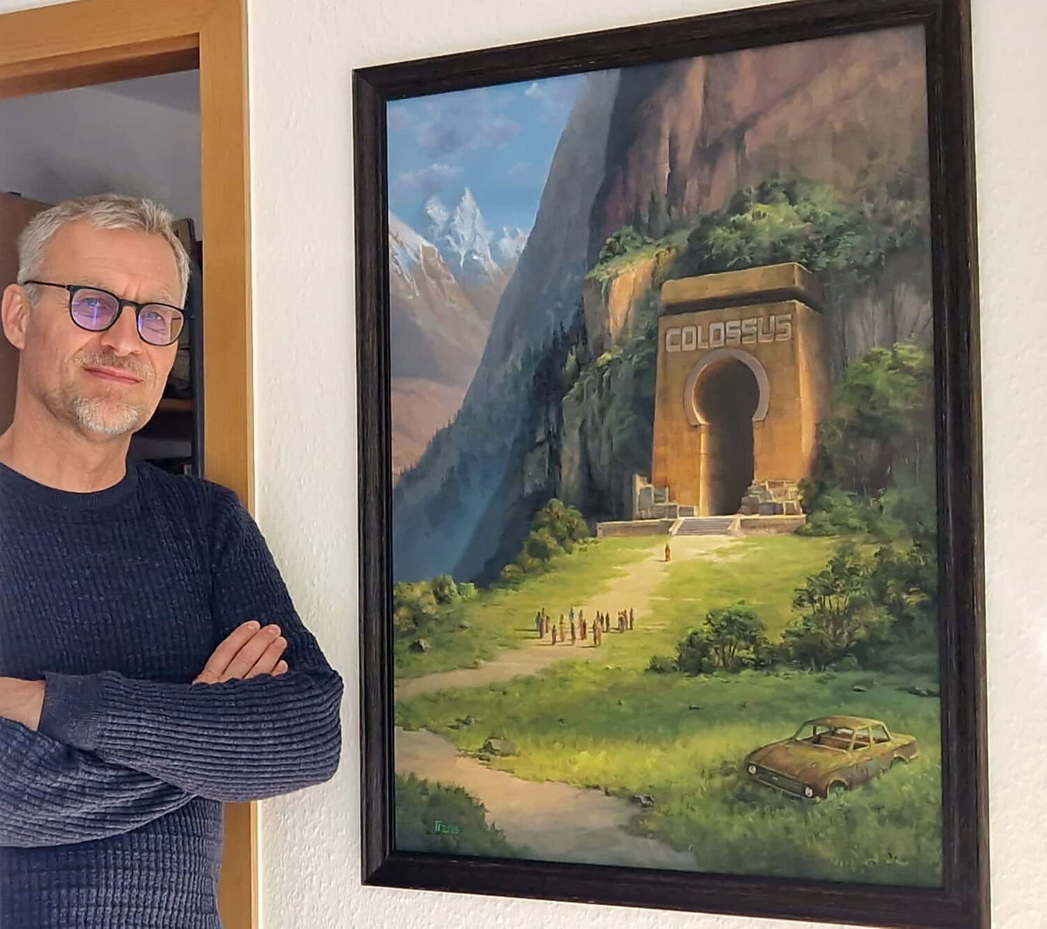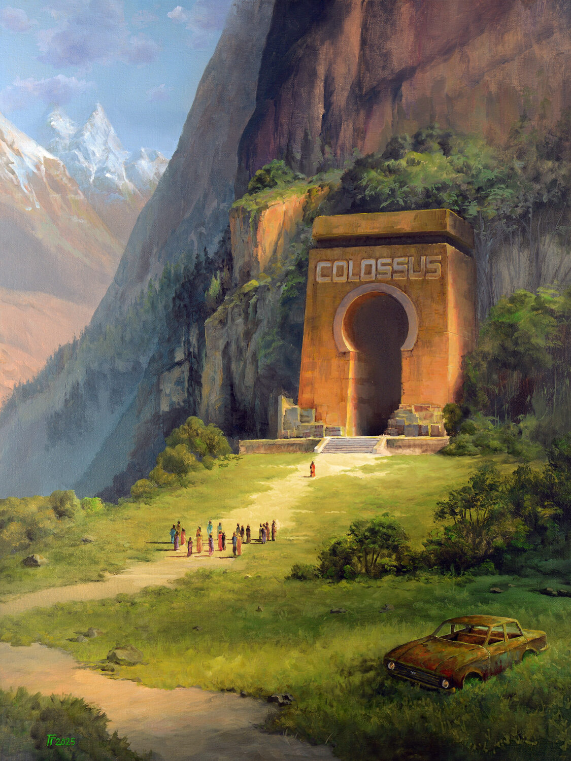 My painting continues the plot and projects it into an unspecified future. Civilization has shattered, human society has regressed to a pre-industrial state. Now, as humanity worships AI as an artificial god, Colossus opens the gates to his lair.