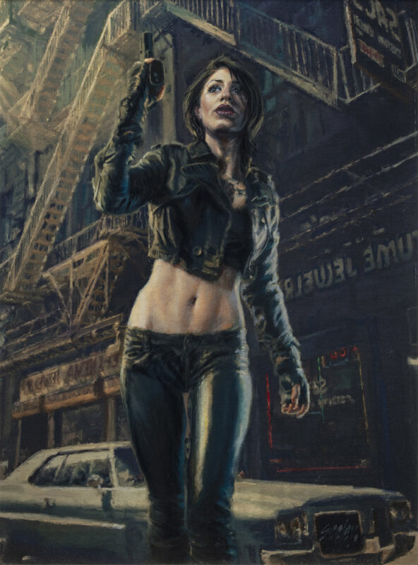 Hard Boiled - Last Curtain - Insight Editions - One in a series of noir images published in The Art of Dave Seeley. These were inspired by the work of Robert McGinnis in the 70 's. Oil on Canvas on Panel - 20" x 29 1/2" Image Area in Black and Silver Wood Frame.