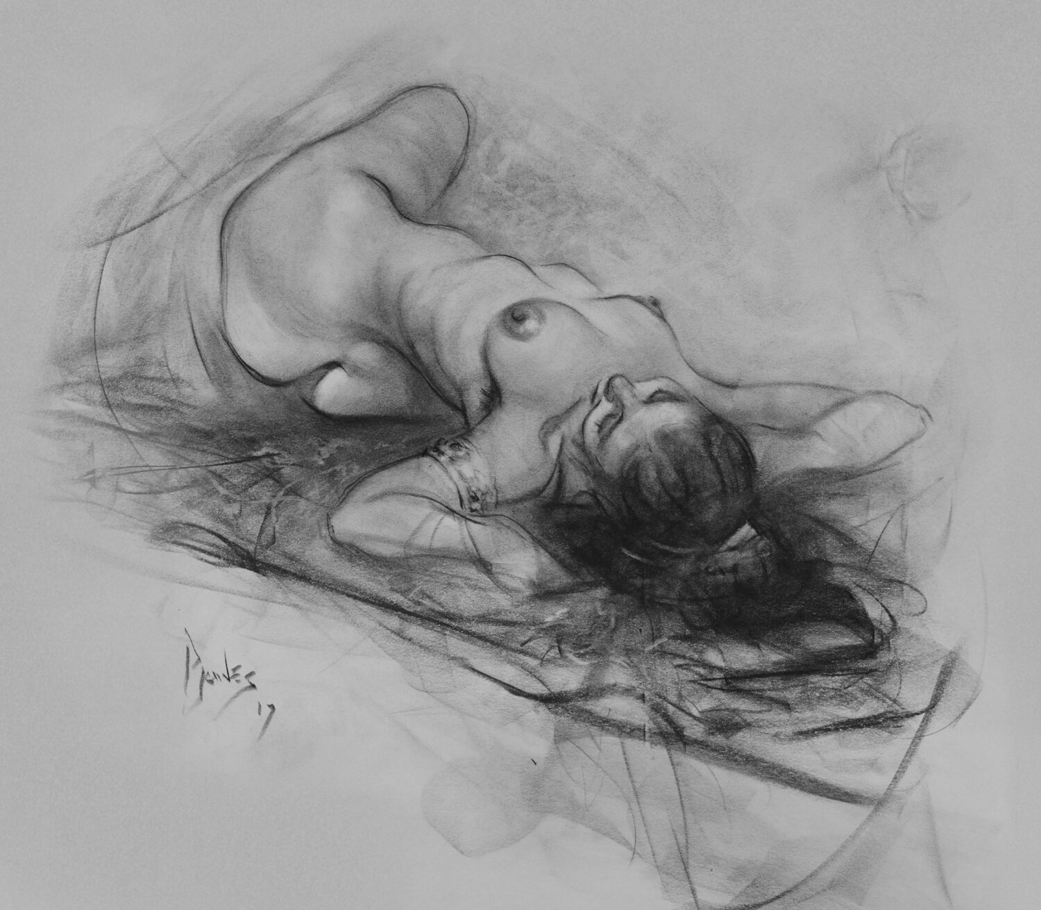 From the book Figures from Life: Charcoal Pencil on Large Newsprint: 18” x 18.4” NOTE: Although newsprint is not considered archival, with care samples have proven to last for hundreds of years, and today's UV glass options render superior protection for non-archival papers. Please be aware though that the paper WILL tan with direct exposure to light. This can add charm to the original drawing as it does to old newspapers and pulp drawings, but it is recommended that you use UV glass/museum glass when framing if you wish to maintain the original paper color. Although the Newsprint drawings are impressively large, they are sold here at lower prices than the archival paper drawings for this reason.