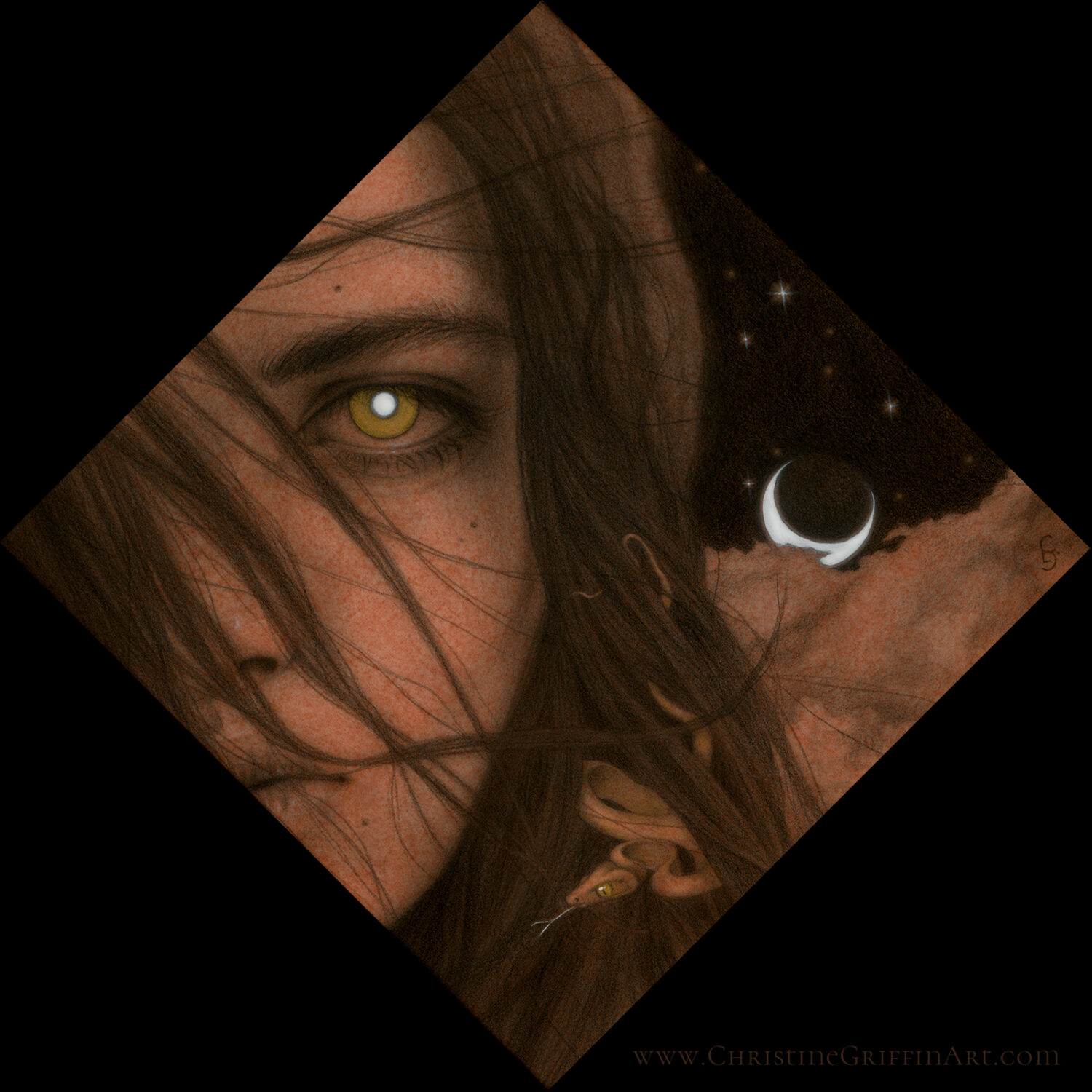 A drawing of the goddess Hekate, depicting many of her icons as well as indications of her rule over night and magic. The ground is an iridescent watercolor wash, giving the whole piece a touch of shimmer.