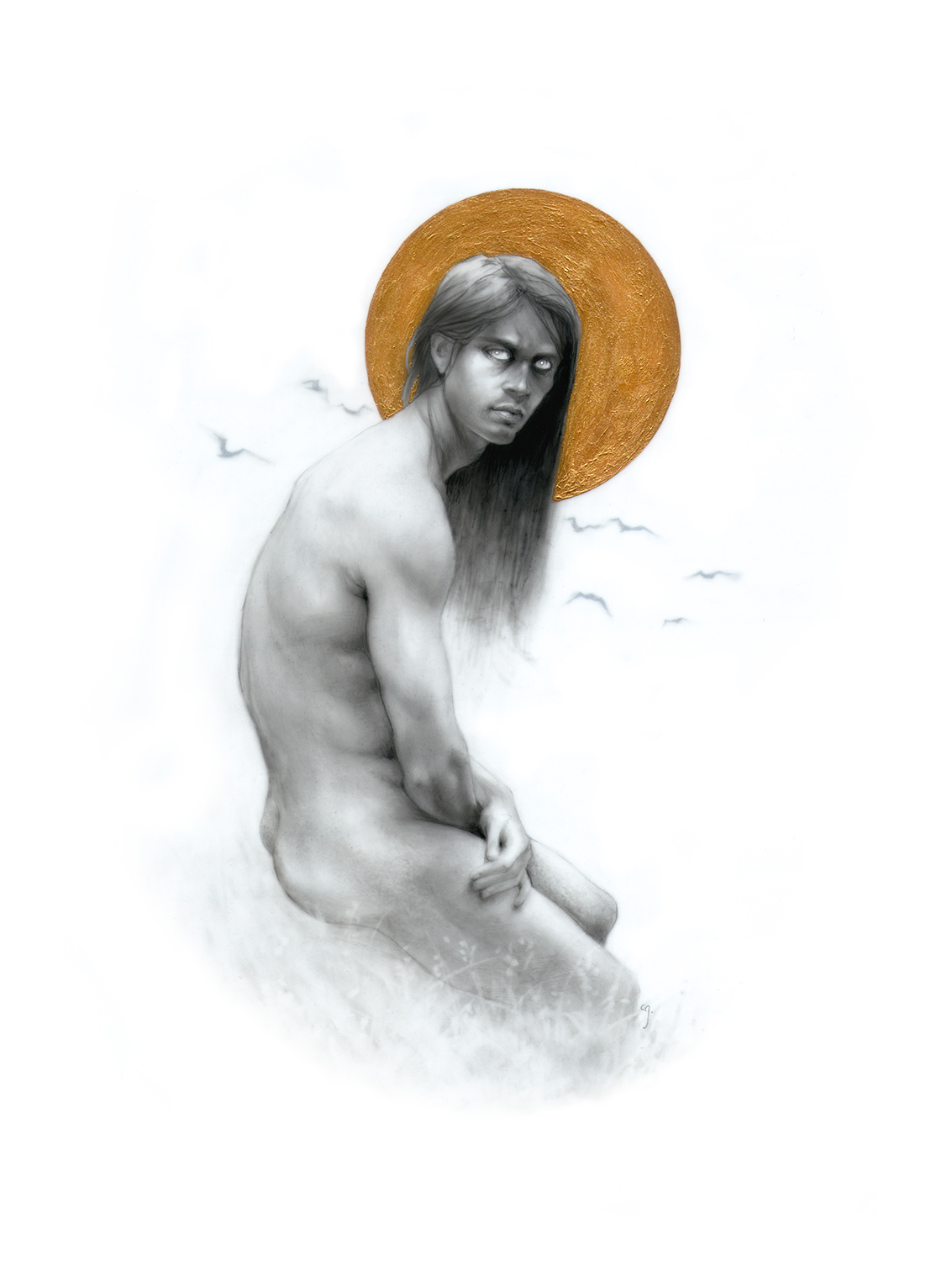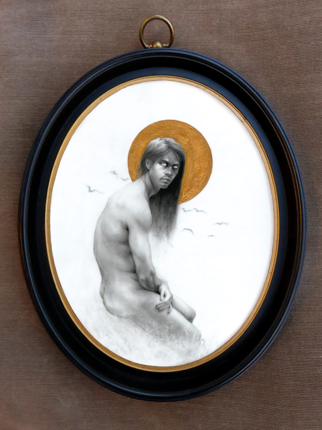 Graphite and gold acrylic on Yupo (acetate film), in an oval, vintage frame; framed to 9" x 12"