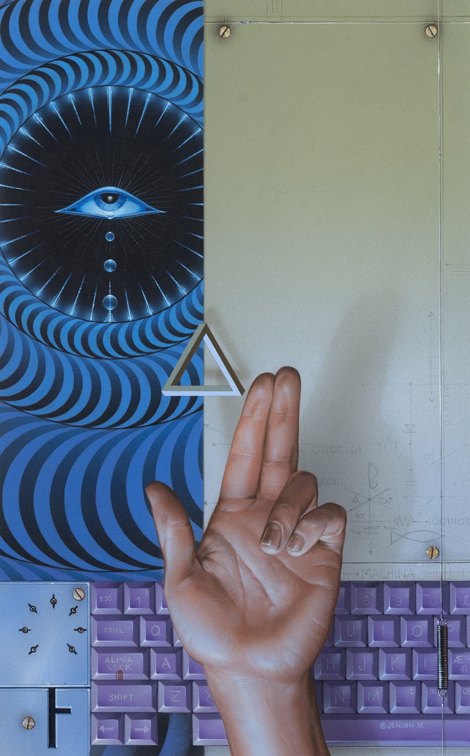 16 x 10 inches, acrylic on illustration board. 1992. Cover for "Deus X" by Norman Spinrad, Bantam Spectra.