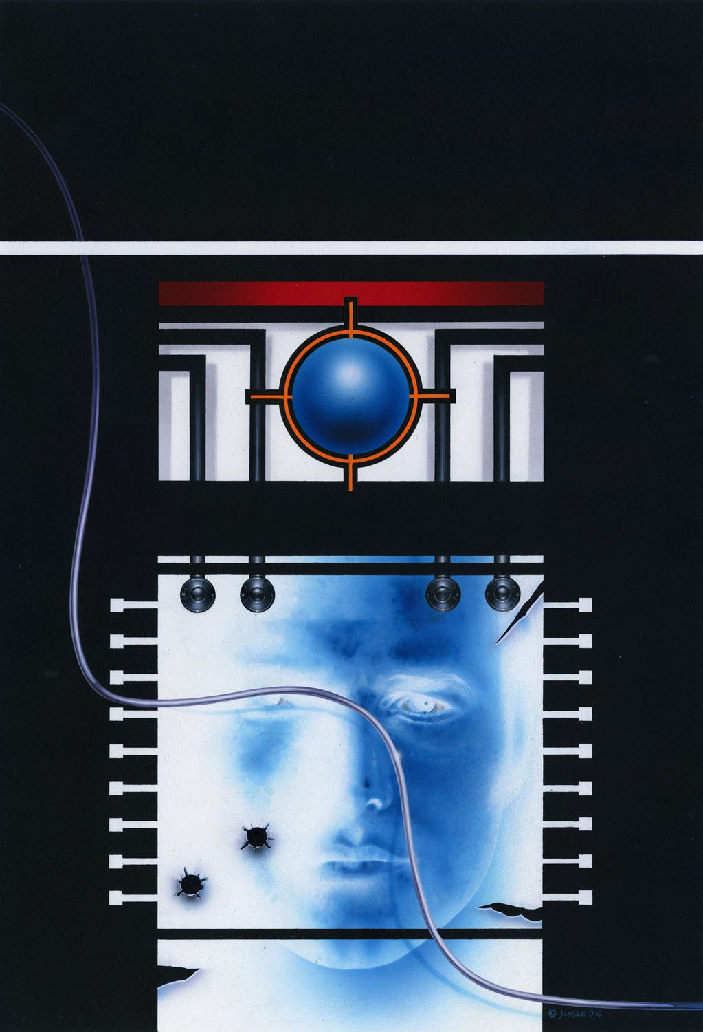 19 x 13 inches, acrylic on illustration board. 1993. Cover for "Interface" by Neal Stephenson, Bantam Spectra.