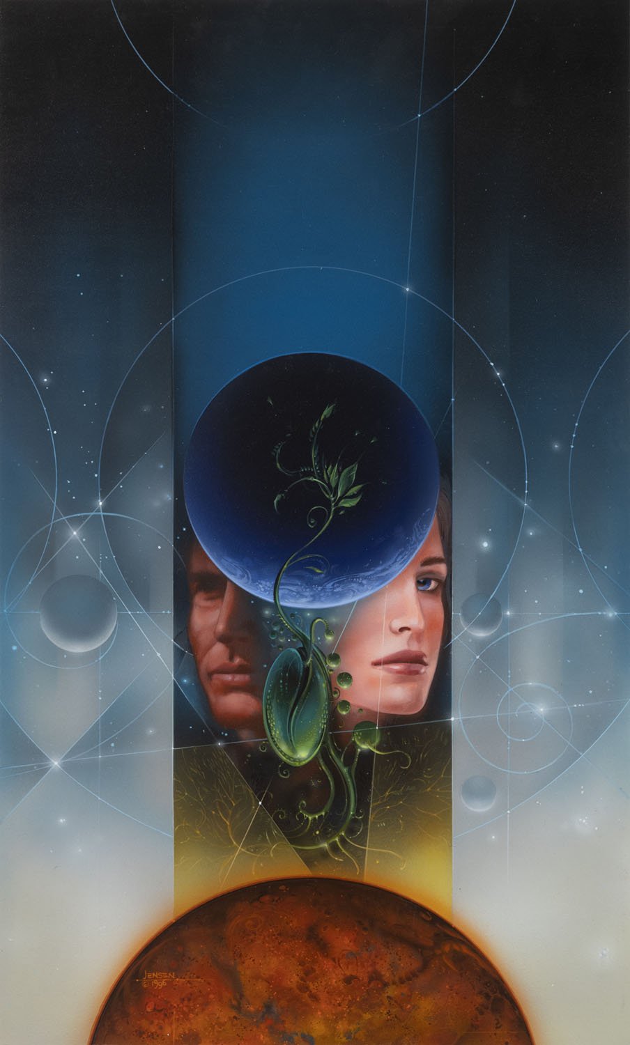 20 x 12 inches, acrylic on illustration board. 1996. Cover to "Seeds of Time" by Kay Kenyon, Bantam Spectra.