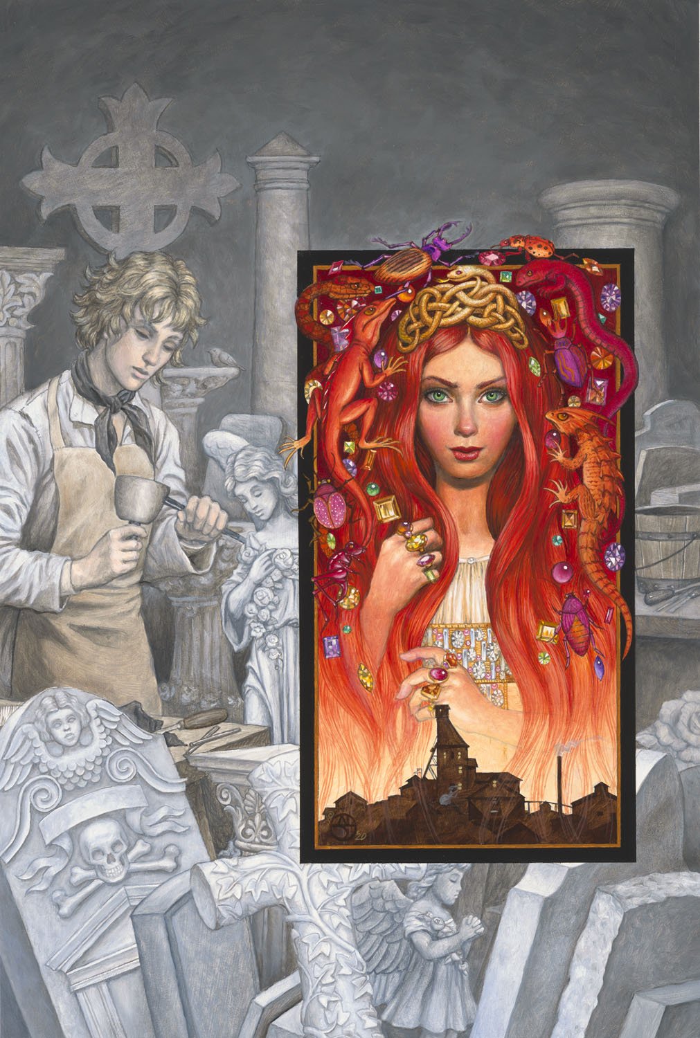 Oils on board, 3/20, 23 x 15.5 inches, signed lower left in box. For the novel in the Elemental Masters series by Mercedes Lackey. The spark for this one was the Russian folk tale “The Queen of Copper Mountain” and the song by Dolly Parton. I was so surprised to find one of Misty’s stories actually taking place in the States. I was able to find the few pictures of the actual Ducktown Copper Mine and use them in the illustration. Jolene is wearing a Russian sarafan under all those fire elementals and hair.