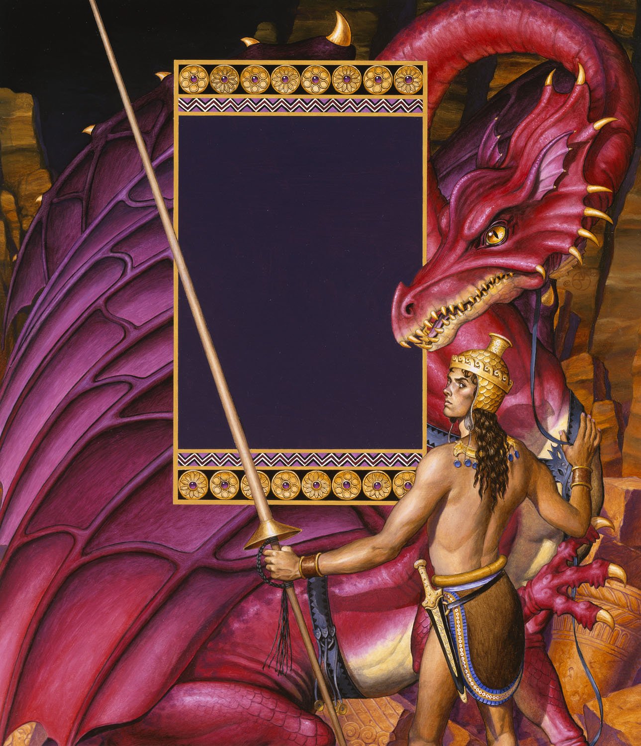 Oils, ink on board, 8/02, 22 x 19 inches, signed right of dragon’s head. For the novel by Mercedes Lackey. This a very vibrant painting, and I was trying to solve the problem of getting a close view of the dragon Avatre and his rider Vetch. I received a whole binder of research from Larry Dixon about the Minoans, which is where Vetch’s costume comes from. Later on, the culture seemed to blend a bit into the Egyptians as well. My model for Vetch was inspired by actor Toby Stephens.