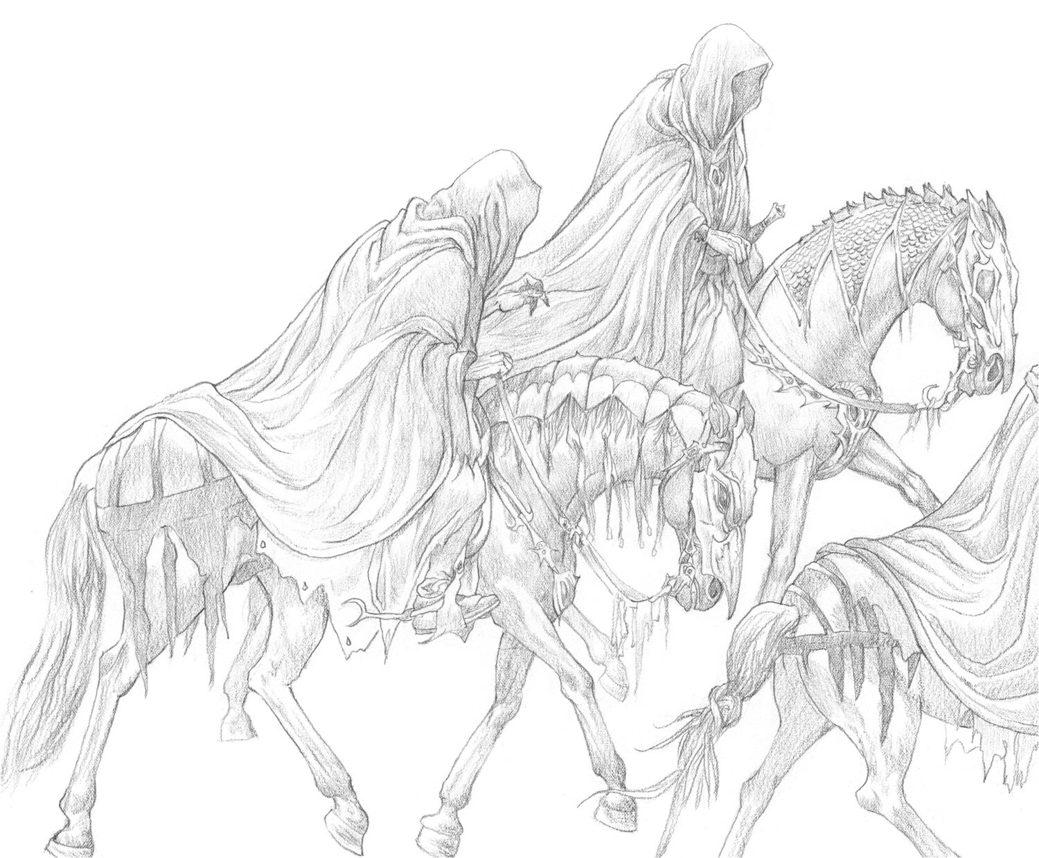 The artwork depicts the Lord of the Black Riders and a gathering of his acolytes. Each of the Black Riders was a king before the rings transformed them into Sauron's wraiths. I sought to depict them as all riding slightly different mounts to give them some individuality to establish their former royal personages.Shipping is additional to be determined by purchasers location.