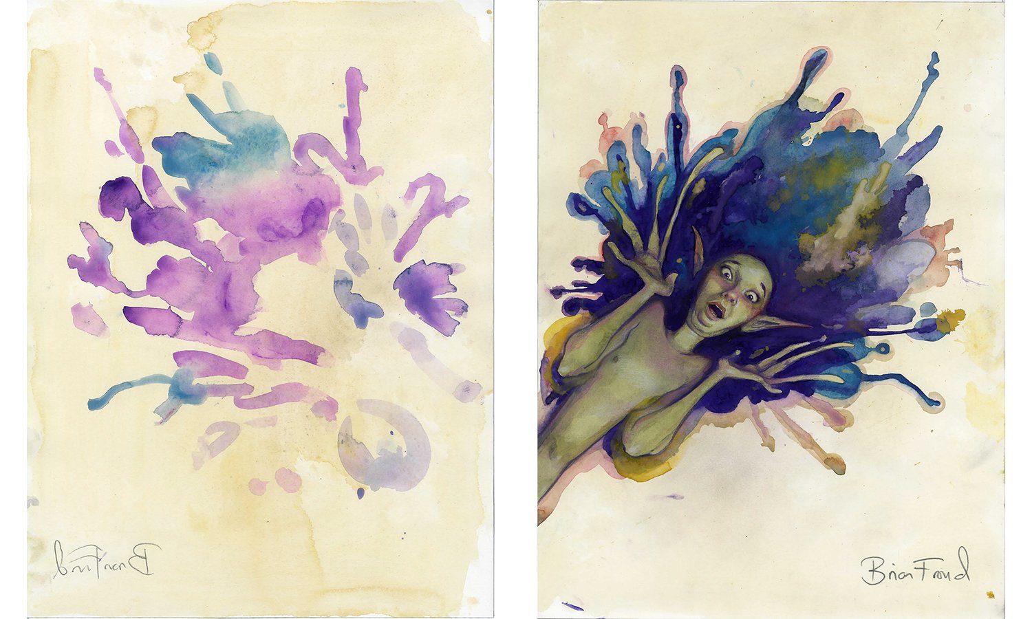 (Set of two watercolor paintings) Each image 12 x 16 inches, watercolor on paper. Combined spread size is 24 x 16 inches. A wonderful opportunity to acquire a matching set of "fairy" and "squash" pages from Brian Froud's Lady Cottington's Pressed Fairy calendar series. This sale includes both sides (two separate 12 x 16 inch images).