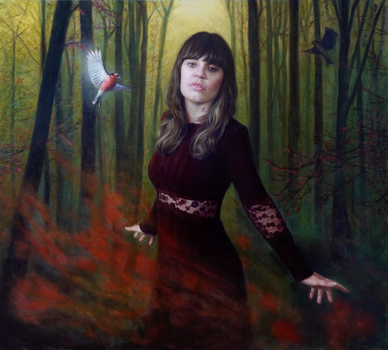 Abandon Hope All ye who enter here. Sometime we walk a fine line in our life path. We can take a wrong turn that can be a devastating decision or we can go right. Which way do we go. The model represents that moment in all our lives when we get lost with ourselves and who we are. We need a spiritual guide and the songbird is her angel watching her. She is encompassed by a tornado of red...danger in her circle. The dark angel bird is behind her on our right, but her left. When an angel come in on your right, they give you energy and on the left, they zap your energy. Red and green colors represent stop or go. She is in her own matrix.