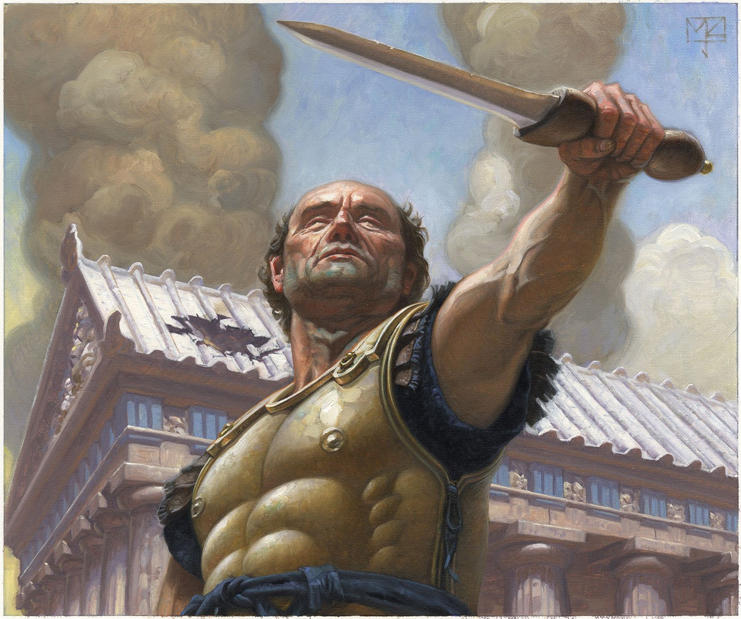 Oil on archival canvas-textured paper. Illustration from the ANACHRONISM historical collectible card game.