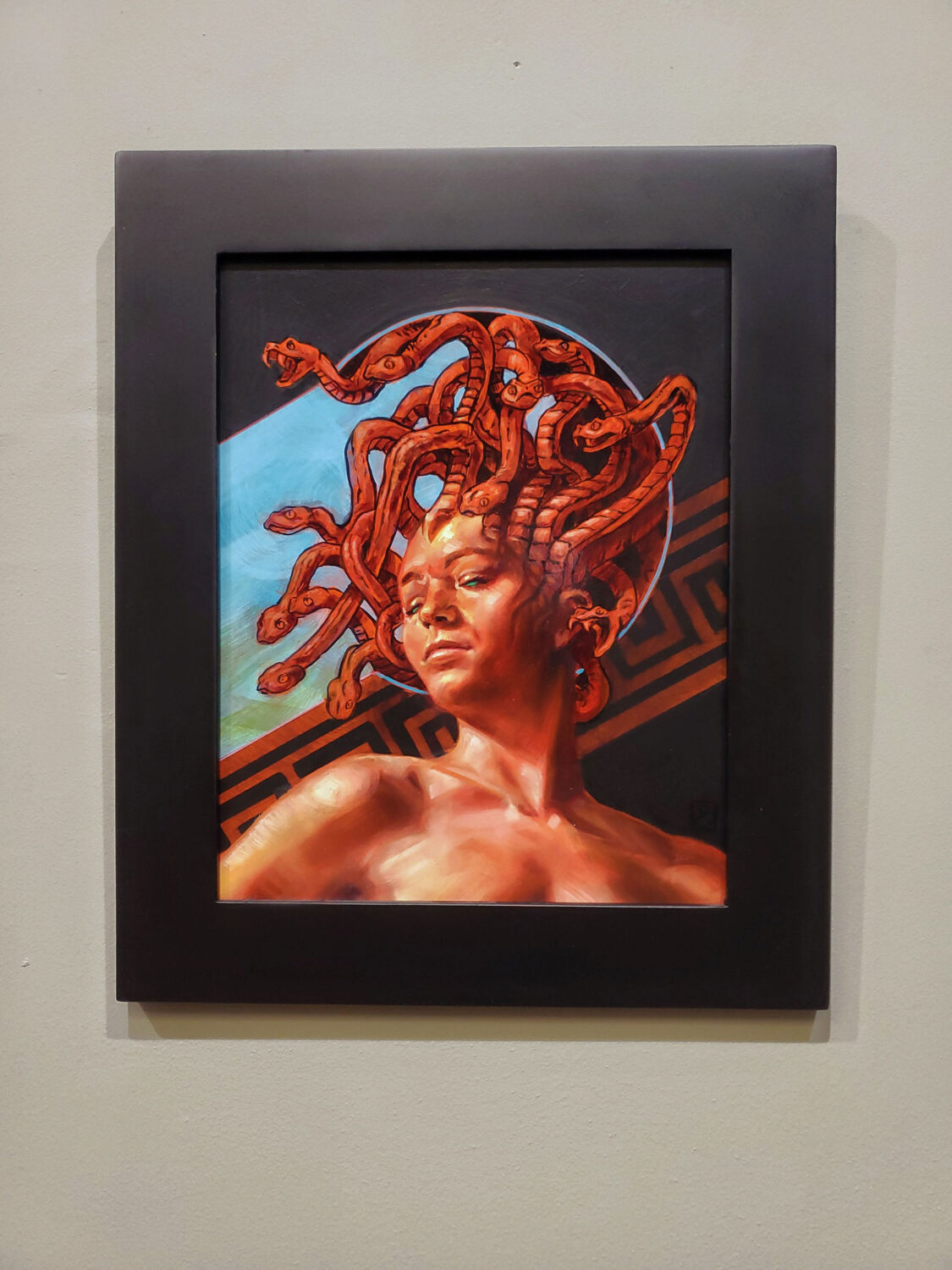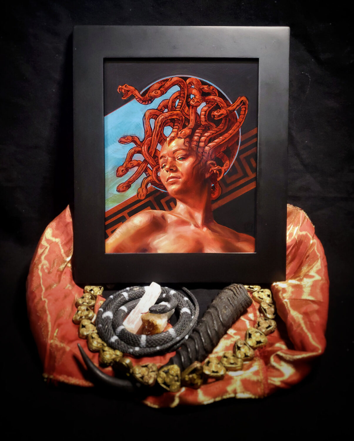 She comes from the ancient past as many things. A monster, a protector, a lover, a victim, a revenant. Through every generation, she is re-formed, made relevant, cast in new roles that speak more towards the current times than any dusty, classical myth.Today her gaze casts its petrifying light on those who pine for an atavistic form of society, where roles are frozen, and society works only for the privileged. Her derisive stare pins them in place, stopping them in their tracks.