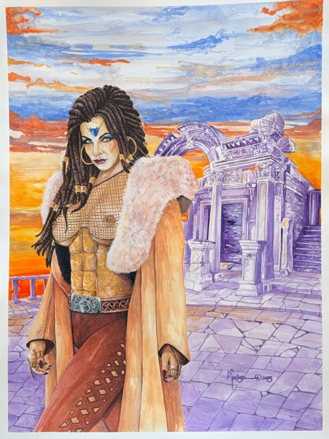The painting is a HUMAMIZED Roman/Classical version of the traditional diescrition of "The Beast". This painting is done in gouache with 24 carrot gold mueium restoration paint.