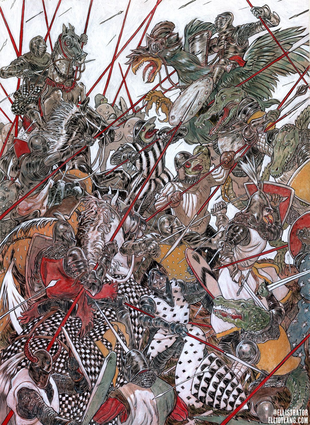 'Melee' is a multiple-character piece depicting a heated battle between knights, frogs, crocodiles, and mounted knights atop horses and a giant cassowary-type bird creature. The piece is mixed media, varnished/sealed for longevity and comes in a basic black frame. Accepted into the Society of Illustrators NY Annual 65.