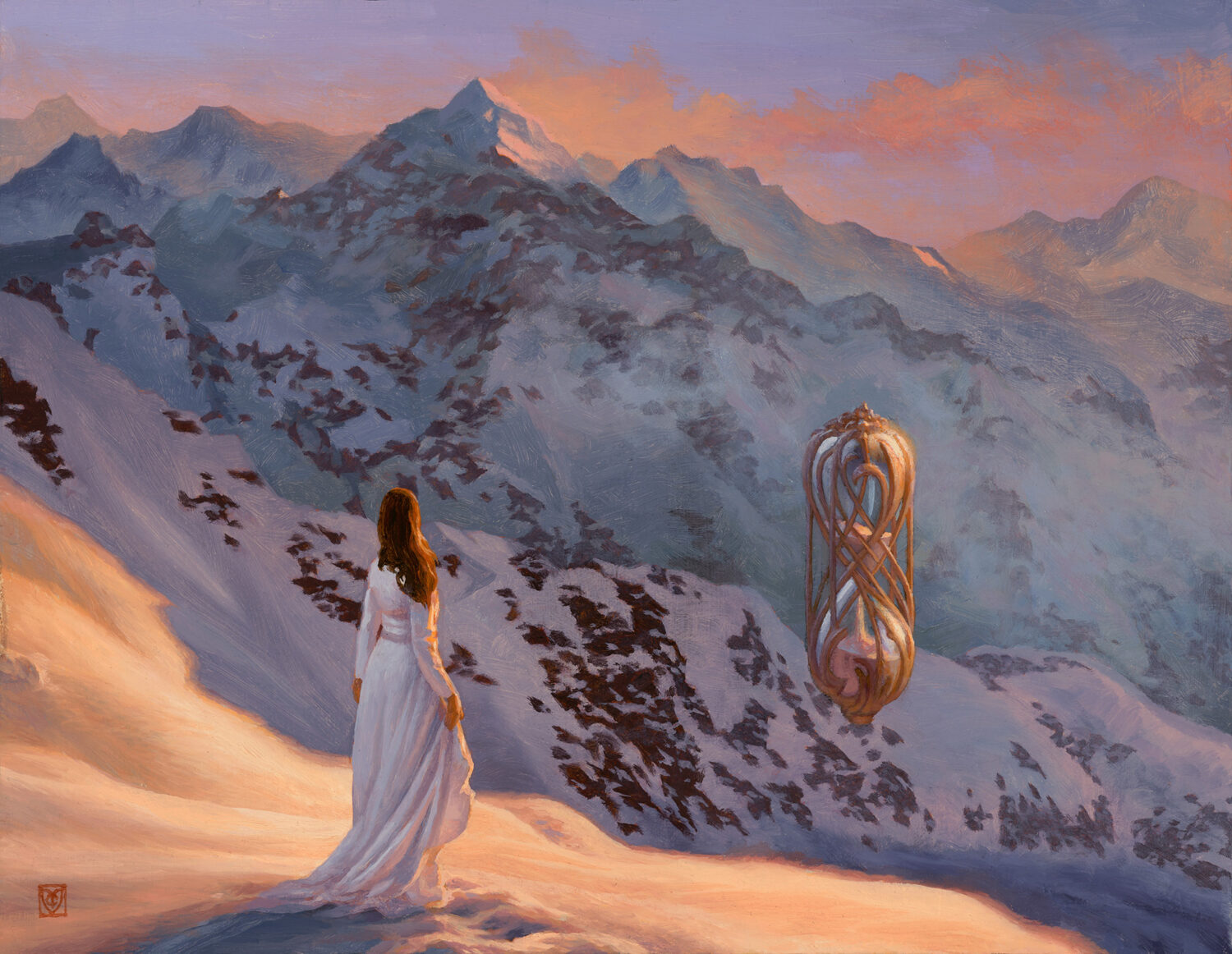 A metaphor on the Human Soul facing time (represented here by the sunset), associated with the mortality of the human condition. Every human being is brought, at one point or another, to facing the unalterable flow of their time capital, but what befalls to the Soul when the very last grain of sand falls to the bottom of the hourglass?