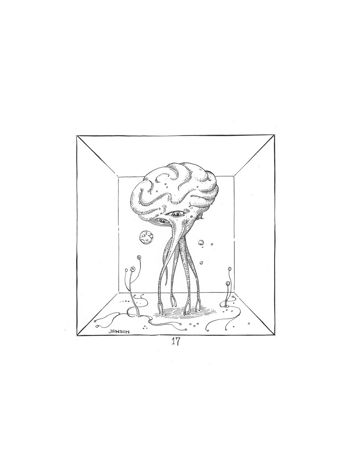 5 inch square image on 12 x 9 board, sumi ink on bristol board.