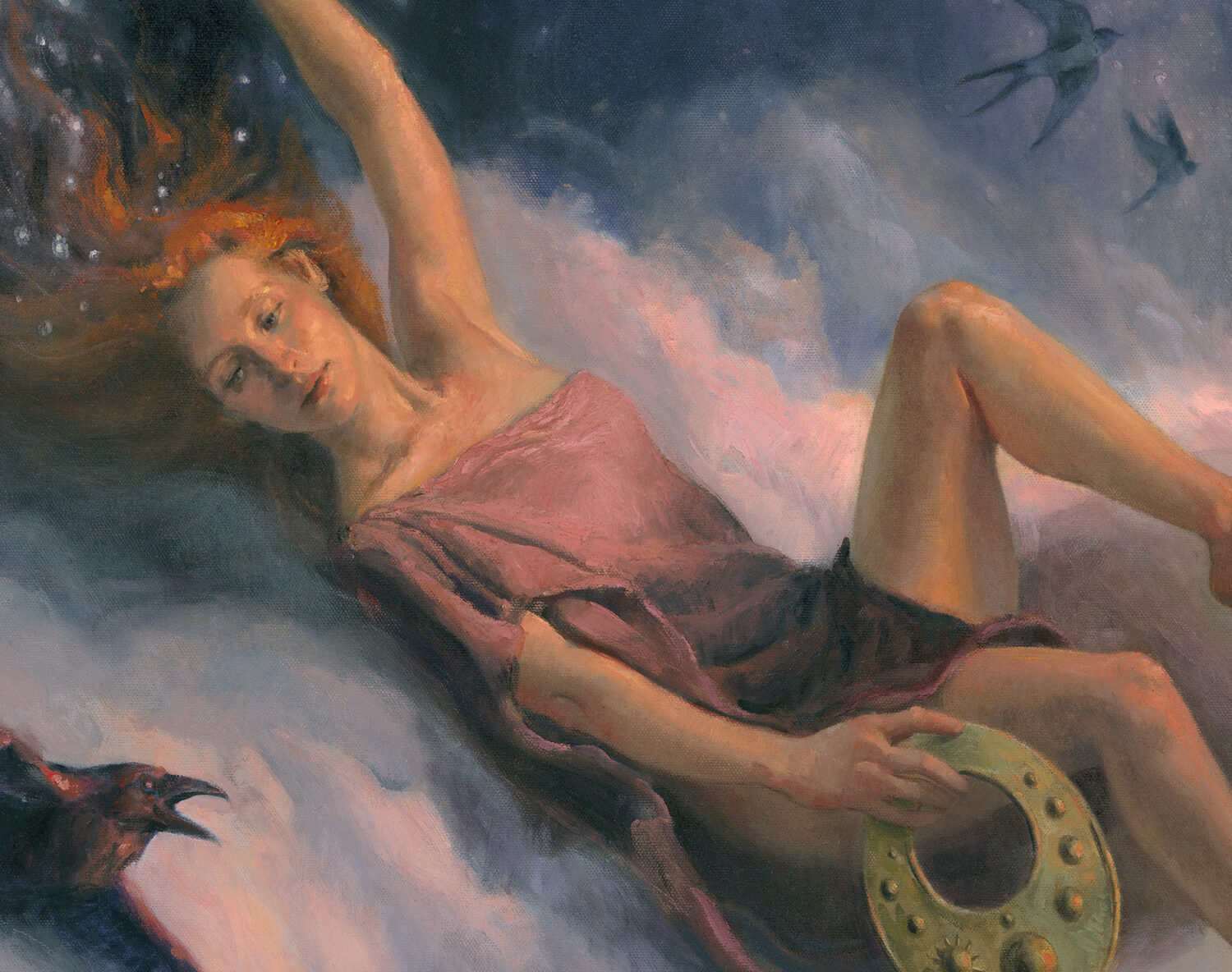 At dusk, W.hen I was a child in Africa, the swallows would come out and swoop and dive around our yard as they chased down insects. I loved their forked tails and speed. Swallows and dusk are therefore synonymous to me. Birds are also symbolic of the spiritual and can be seen as emmisaries of the spiritual. Odin's ravens Huginn (thought) and Muninn (memory) are depicted.