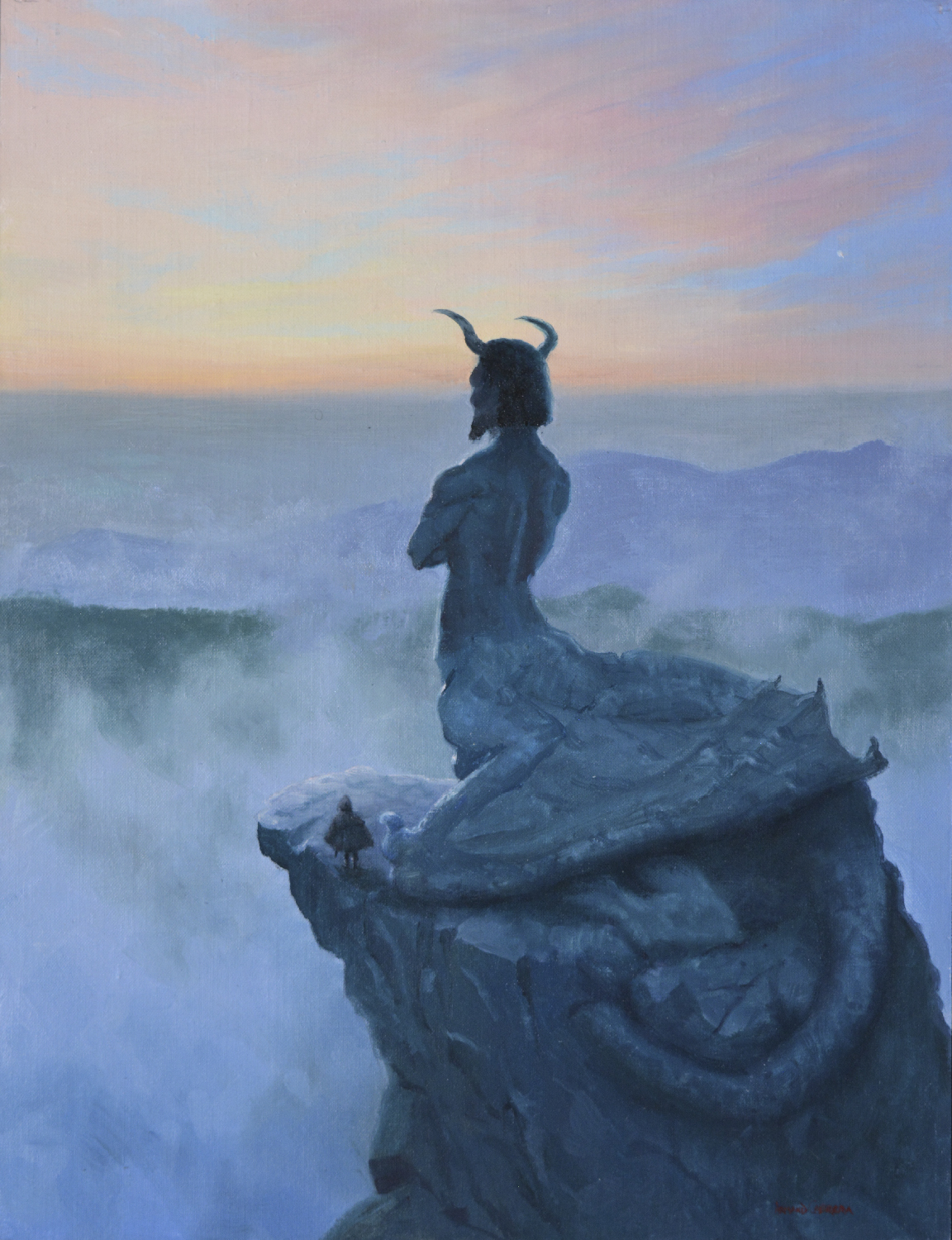 Unframed. A painting of Morningstar and Jack of Shadows at the edge of sunrise.