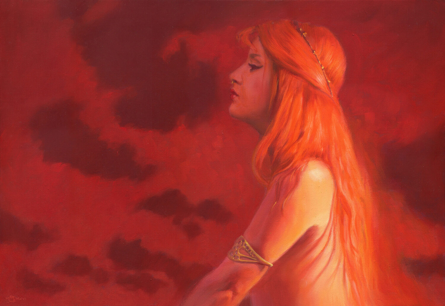I love the colour red in paintings, here I tried a portrait of a favourite model all in reds and oranges.
